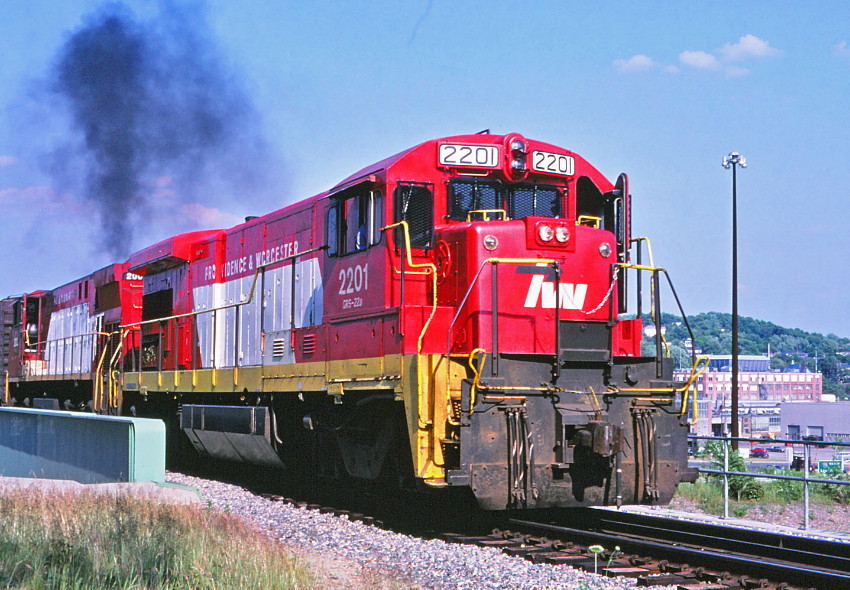 Providence & Worcester @ Worcester, Ma. The P&W's 2201, a B23-7, leads the Gardner trick across the Route 190 bridge near Norton Abrasives. Photographed by Bruce Macdonald, July 13, 1982. Added to the photo archive by Bruce Macdonald, April 12, 2016. Railroad: Providence & Worcester. | Bruce Macdonald's awards: |        |
