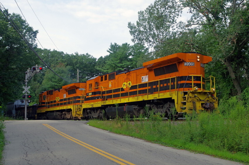 Providence & Worcester @ North Oxford, Ma. With Long Hood forward, Norfolk Western style, NRWO hammers across Depot Road, with horns a blasting. Photographed by Bruce Macdonald, August 16, 2021. Added to the photo archive by Bruce Macdonald, August 16, 2021. Railroad: Providence & Worcester. | Bruce Macdonald's awards: |        |