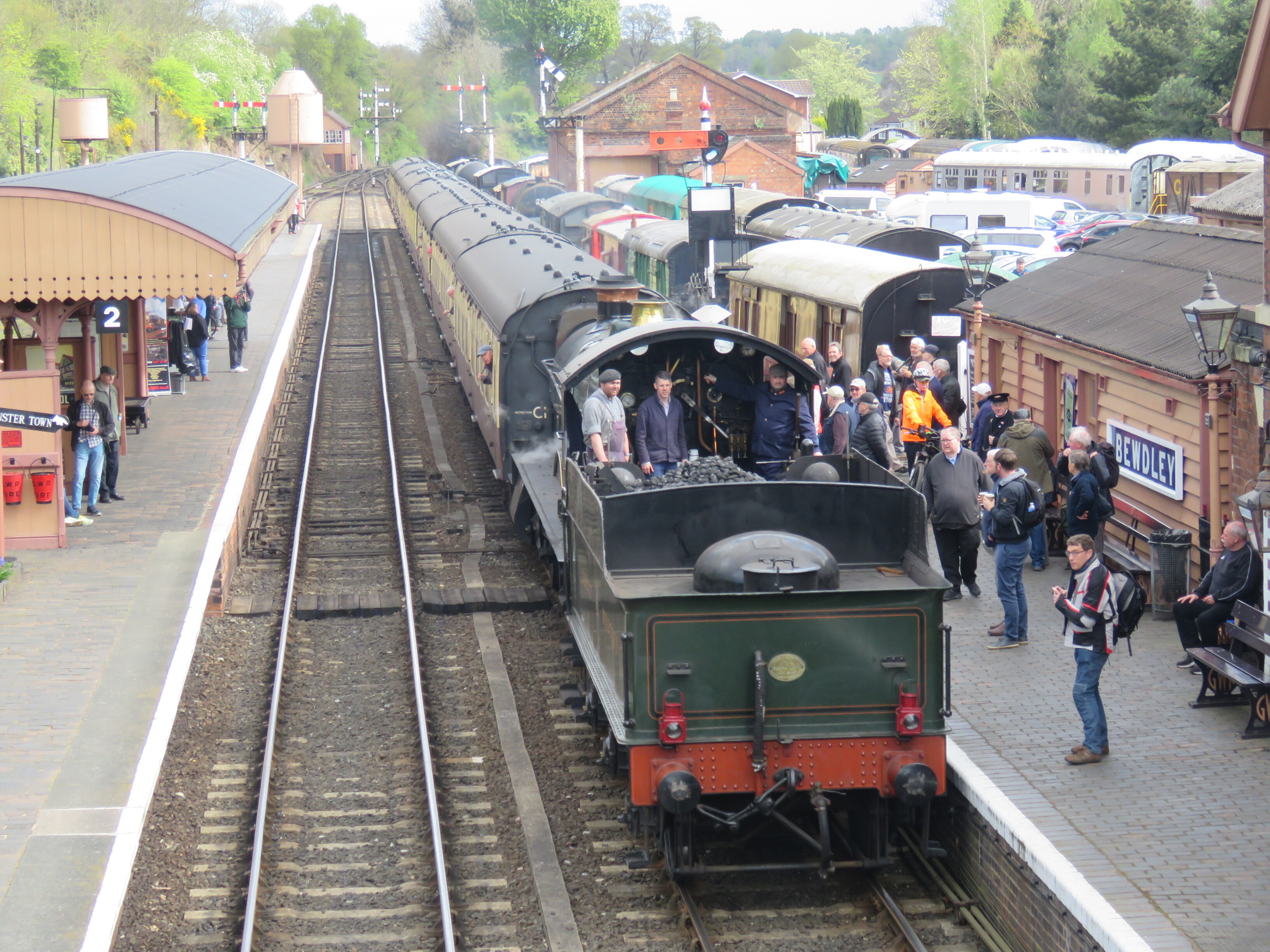The view from the footbridgeAt Bewdley station, of GWR Saint class 4-6- 2999 Lady of Legend, as it enters the platform.