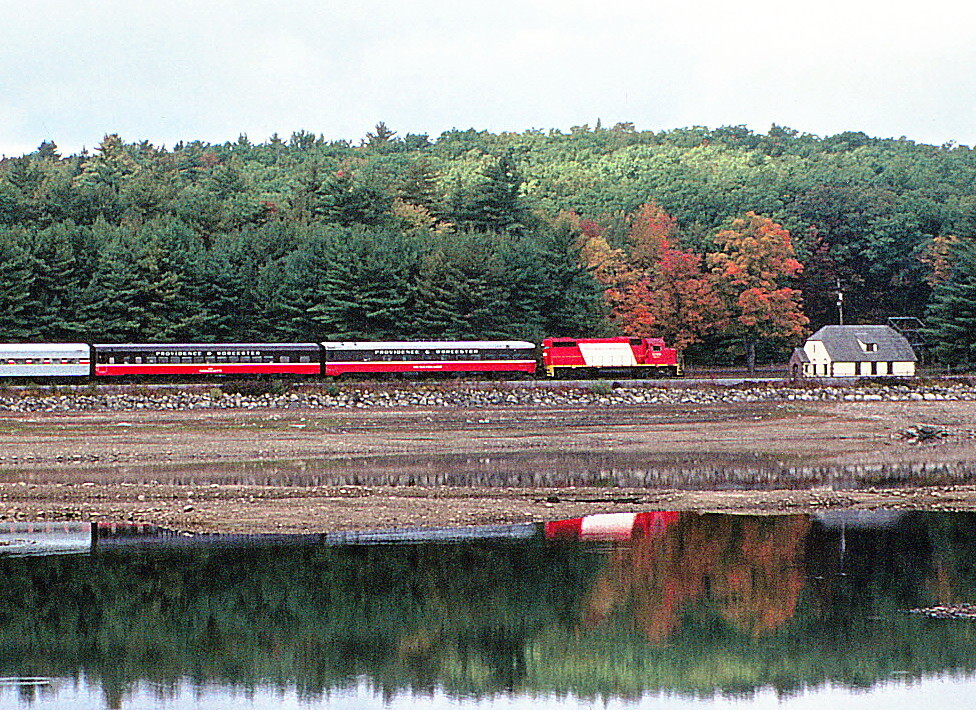 Providence & Worcester @ Holden, Ma. Gardner bound at the Quinapoxet Reservoir. Photographed by Bruce Macdonald, October 3, 1987. Added to the photo archive by Bruce Macdonald, June 20, 2024. Railroad: Providence & Worcester. | Bruce Macdonald's awards: |        |