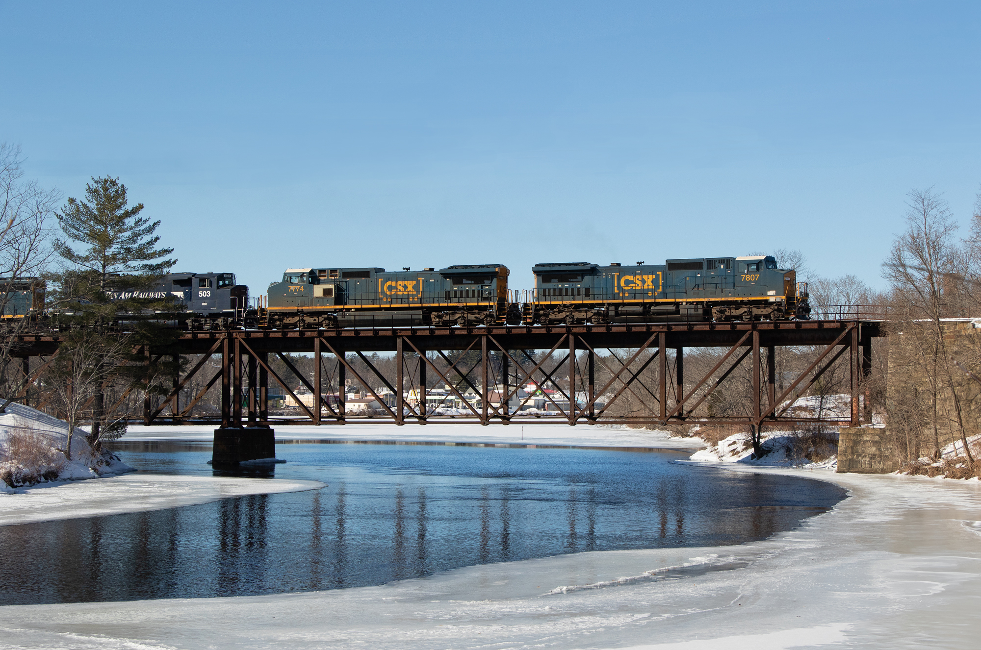 CSXT 7807 Leads L070 over the Androscoggin RiverL070 with CSXT 7807 - CSXT 7774 - MEC 503 - CSXT 6219 - CSXT 8089 heads east with a short train over the Androscoggin River into Lewiston, Maine.