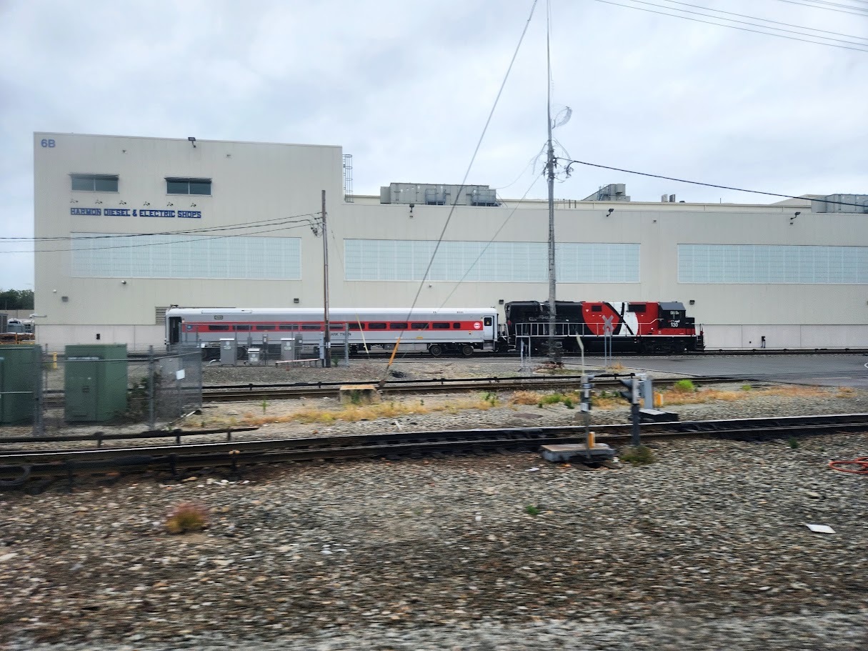 CTRail at HarmonA CTRail coach and locomotive alongside the Harmon shops of Metro-North in Croton-Harmon, NY