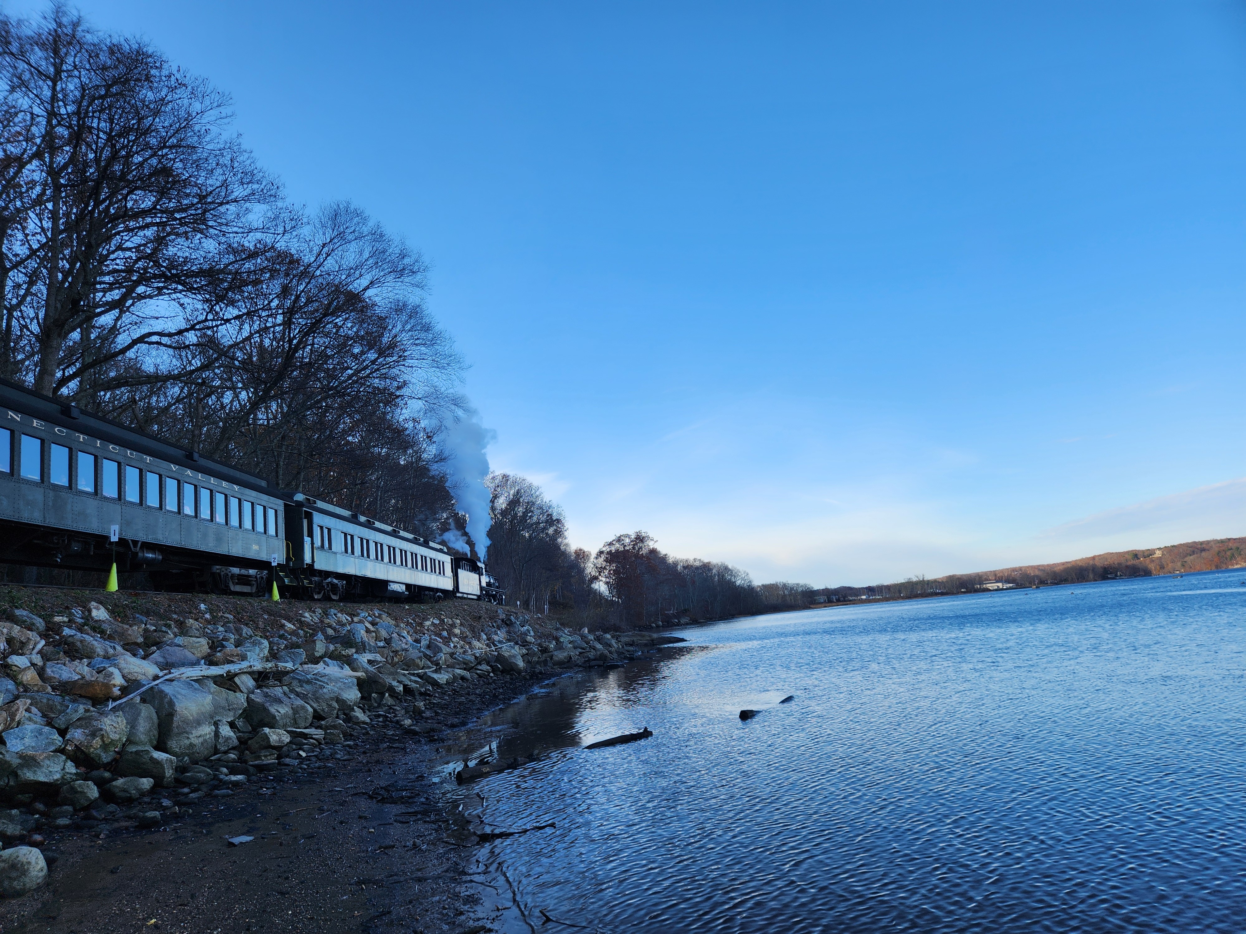 NPE2 slows for its stop at Riverside just north of Deep River Landing, before shoving back into "North Pole station" to await the arrival of NPE-1 from the north.
