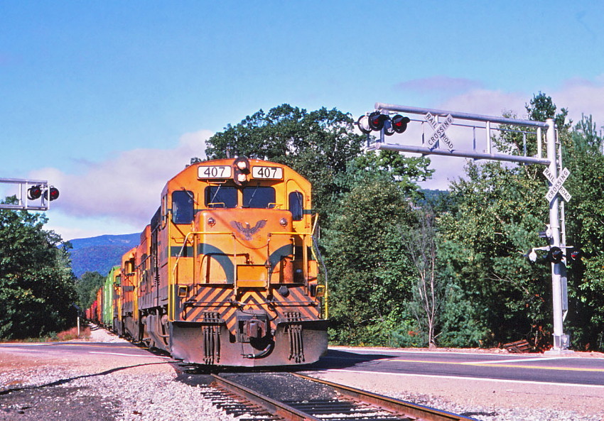 A south bound Mountain Division freight crosses Route 302 as it makes its run to Portland, Me.