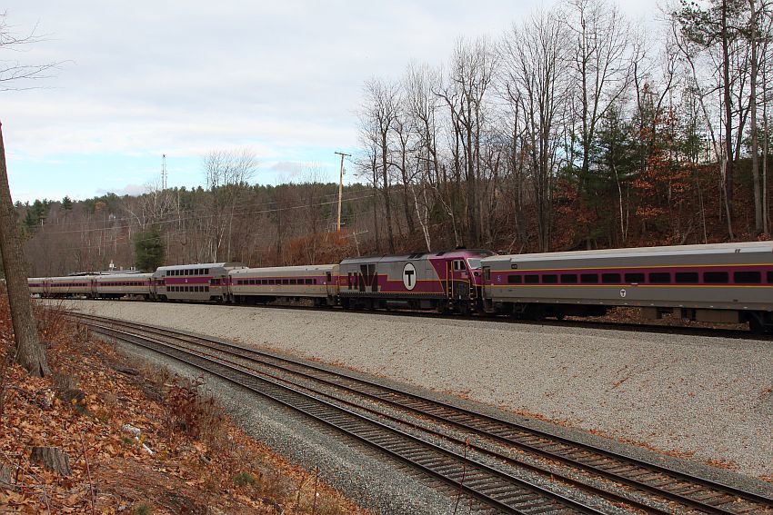 West Fitchburg, MA Inbound train 2406 with two train sets departing Wachusett Station. Photographed by Bruce Nelson, November 27, 2016. Added to the photo archive by Bruce Nelson, November 27, 2016. Railroad: Pan Am Southern. » Contact the person who posted this photograph.