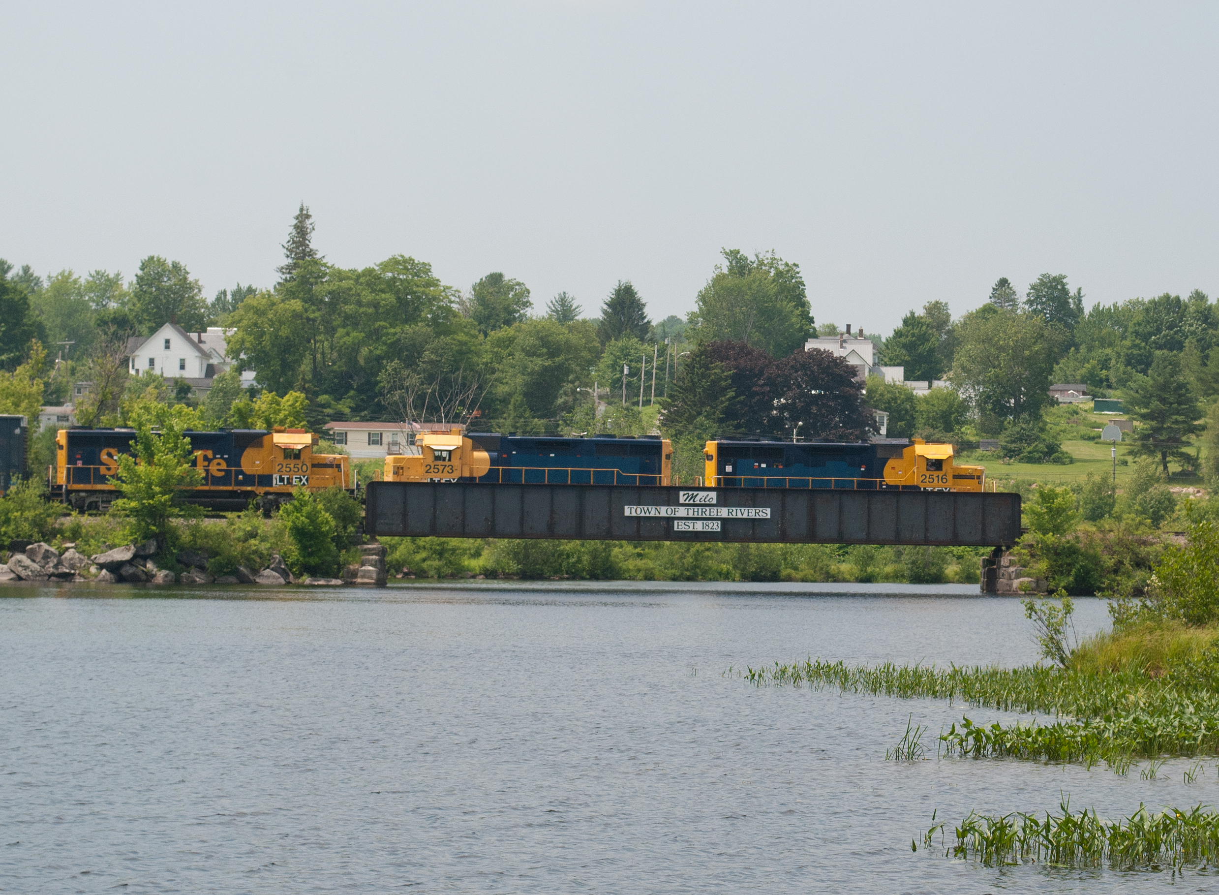 Crossing Sebec RiverCMQ Job 202 with LTEX 2516 - LTEX 2573 - LTEX 2550 heads north over the Sebec River in Milo ME on a warm summer afternoon.