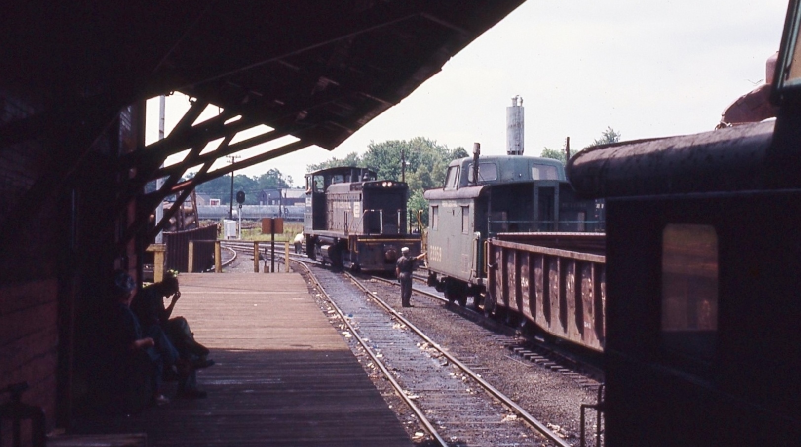 Framingham, MA. Its getting to be a hot one! But, there's not a lot going on, except to add a former Pennsy cabin car to the freight house track. Photographed by Ken Patton, July, 1975. Added to the photo archive by Ken Patton, May 24, 2019. Railroad: Penn Central. » Contact the person who posted this photograph.