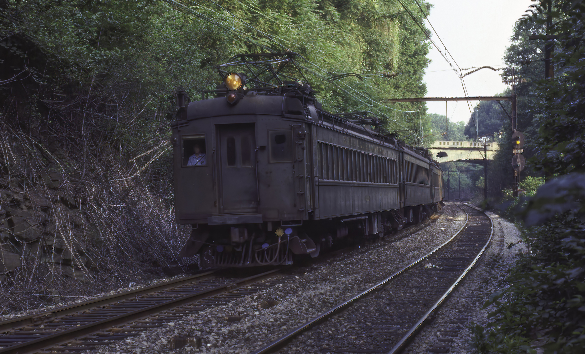 Former DL&W Electric MU Train on Conrail at Glen Ridge, NJThis Hoboken-bound MU Train is approaching its 1st stop after leaving the Montclair terminal at the end of the 1st branch of the DL&W to be electrified in 1930. One Thomas Edison helped the DL&W decide to use direct current, and he handled the throttle for the 1st mile out of Hoboken on the 1st electric run to Montclair. I suspect these cars, which dated to that time, looked very much the same in his day, although 'Erie' did not appear on the letterboards until 1960. This car looks as though the letterboard has been repainted and the Erie Lackawanna named is centered. Many of the cars were relettered with the "ERIE" name squeezed in ahead of the Lackawanna name that remained centered where it had always been.