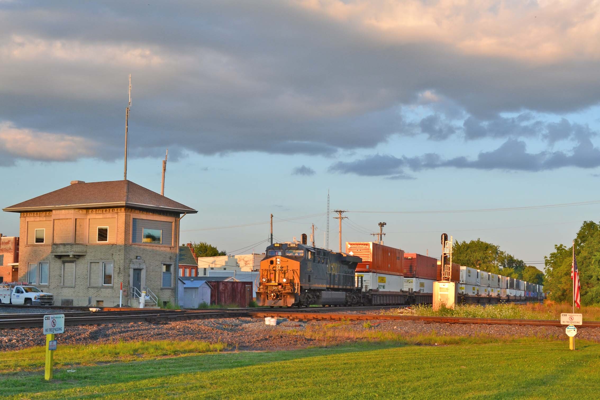 CSX 996CSX 996 passes the tower at Deshler, Ohio. with a WB stack train. CSX 3249 was helping mid train.