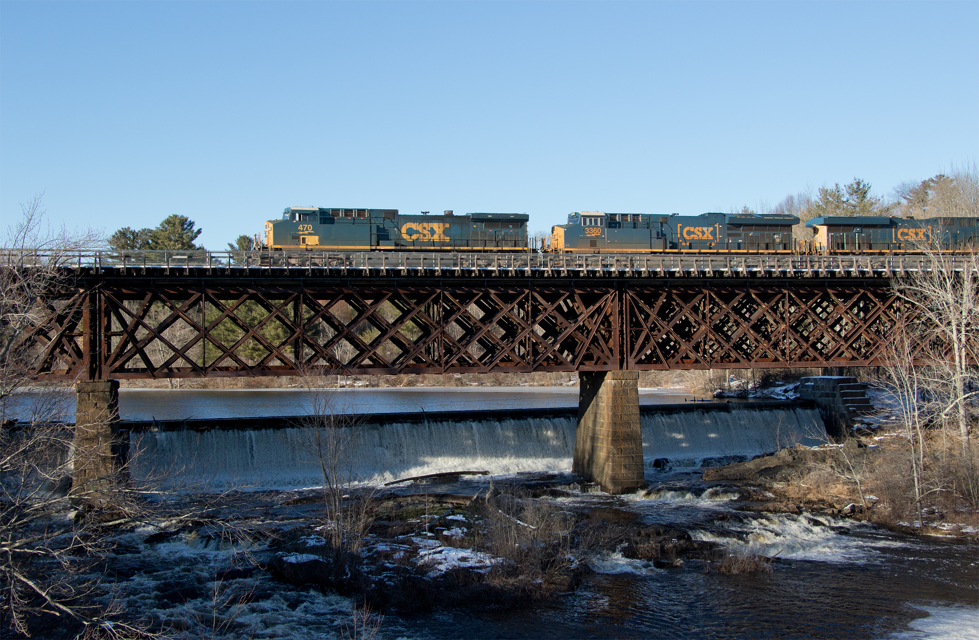 CSXT 470 Leads M427-20 Across the Salmon Falls RiverM427 with CSXT 470 - CSXT 3360 - CSXT 3059 - CSXT 6533 and 100 cars crosses the Salmon Falls River from South Berwick ME into Rollinsford NH.