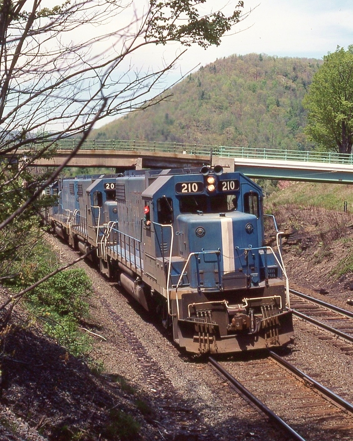 Shelburne Falls, MA. Eastbound. Photographed by Ken Patton, May, 1976. Added to the photo archive by Ken Patton, May 27, 2024. Railroad: Boston & Maine. » Contact the person who posted this photograph.