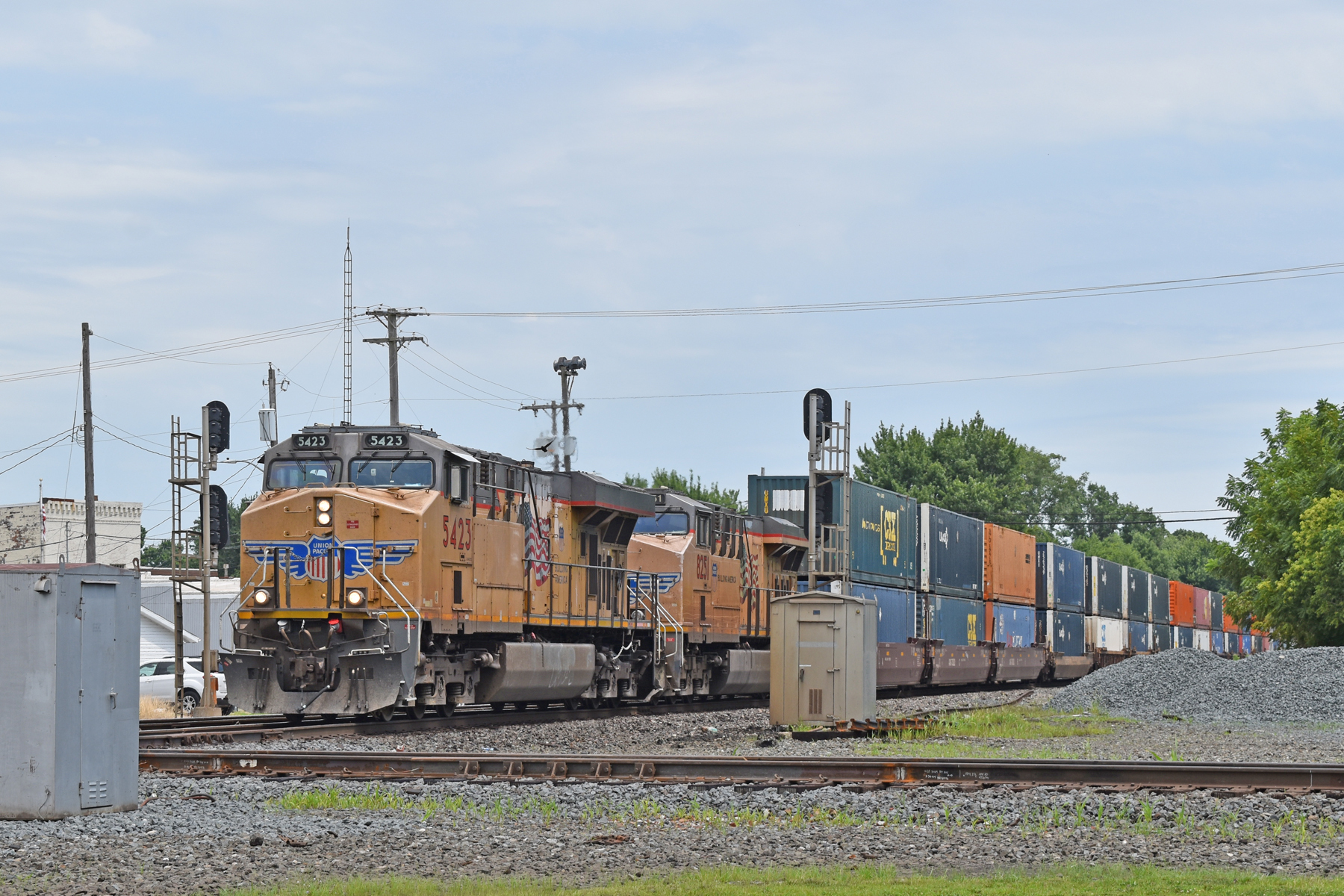 UP 5423UP 5423 and 8251 are seen at Deshler, Ohio pulling a WB Intermodal at the CSX diamond.