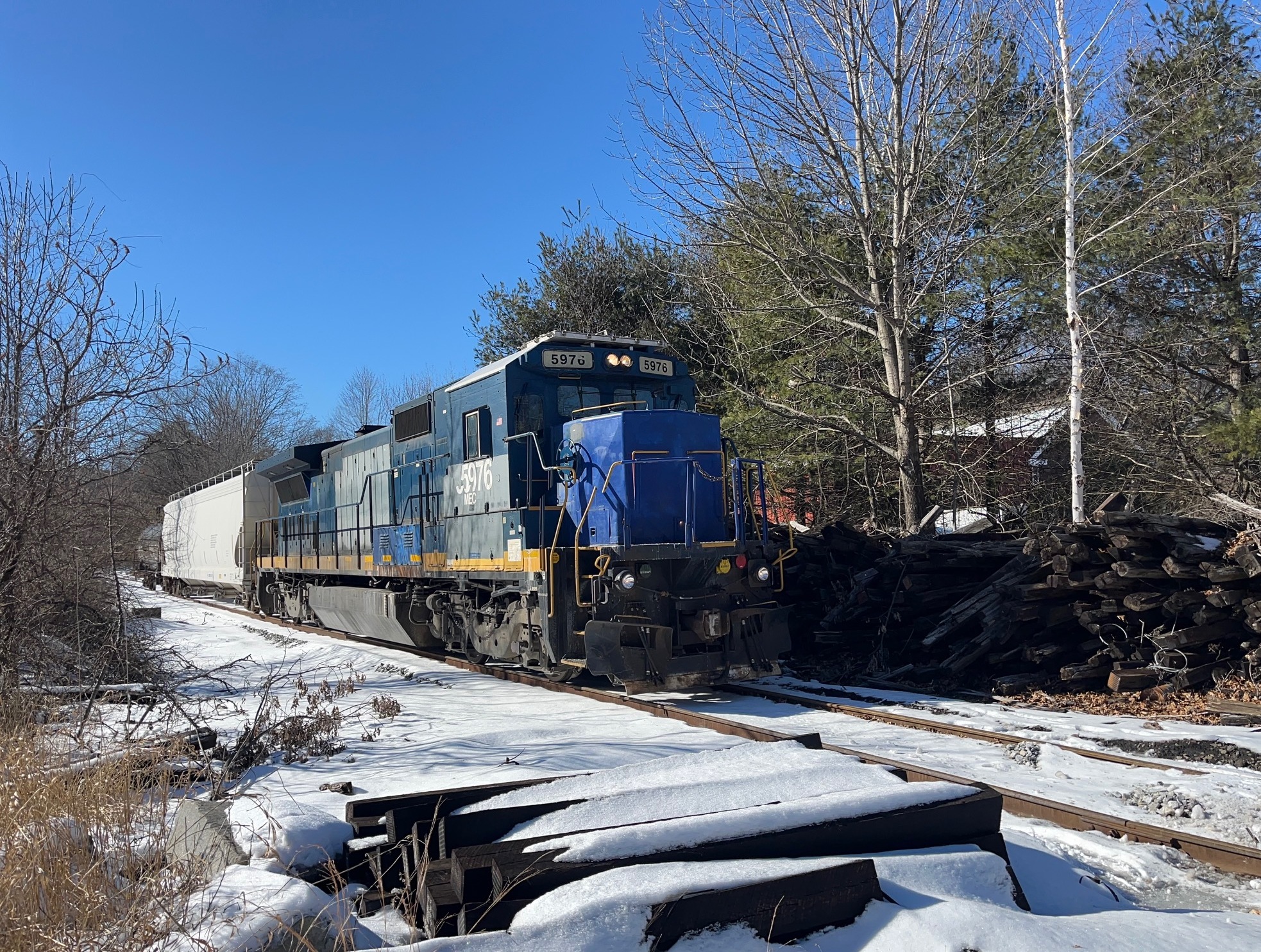 MEC #5976 is leaving the Wilton Yard about to cross Pine Valley. 5976 is here for the 1st time on the ole Hillsboro branch according to my sources.