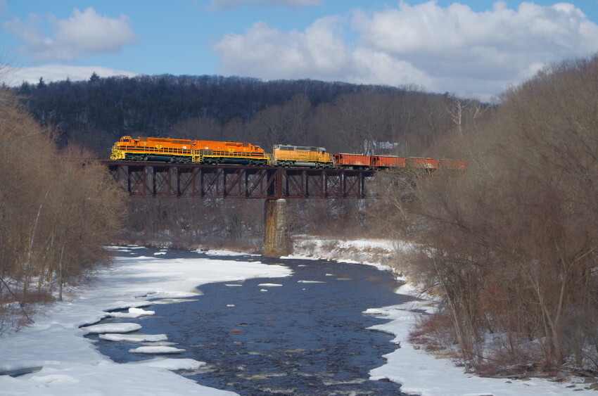 New England Central @ Millers Falls, Ma. NEC611 traverses the trestle. Photographed by Bruce Macdonald, February 26, 2025. Added to the photo archive by Bruce Macdonald, February 26, 2025. Railroad: New England Central. | Bruce Macdonald's awards: |        |