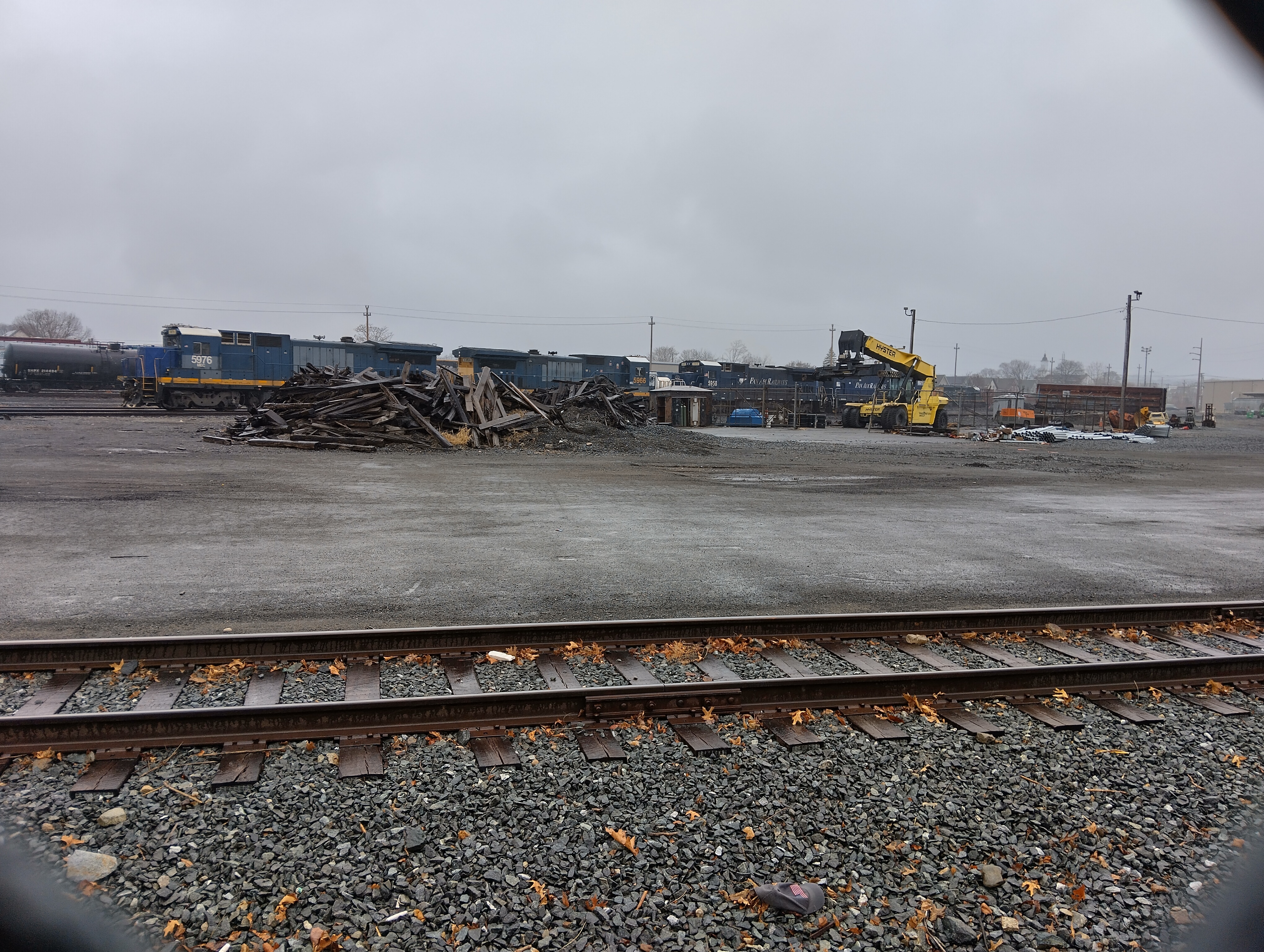Lawrence MA yardOn an overcast Saturday afternoon we took a spin over to see W080 (ballast train) that was reported tied down. It's power was CSXT 8801-3444-798 and 63 loads of ballast. 8801 was taken off the headpin at some point and put on a yard track while the gevos and cars were on another track.