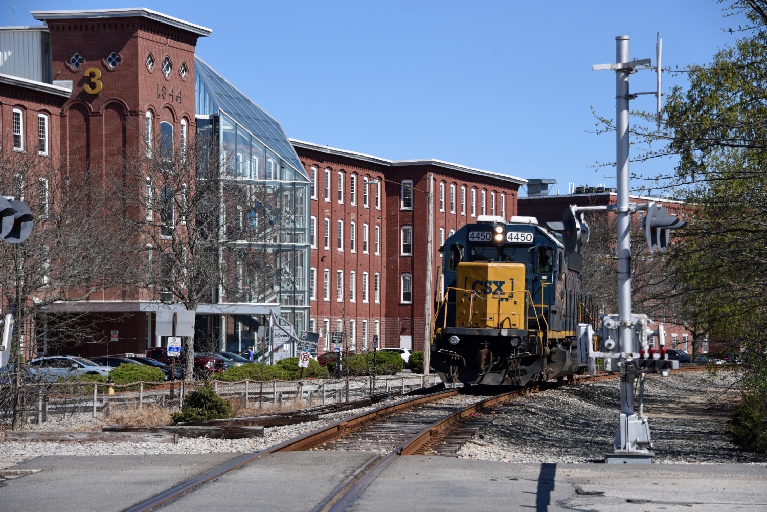 Light EngineToday's LO66 consists solely of light engine 4450 passing northbound (away) through the Manchester, NH Millyard.