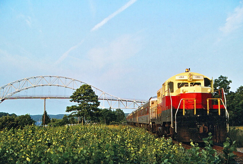 Cape Cod & Hyannis @ Bourne, Ma. An excursion train slips under the Bourne Bridge as it continues its run. Photographed by Bruce Macdonald, July 8, 1988. Added to the photo archive by Bruce Macdonald, September 24, 2025. Railroad: Cape Cod & Hyannis. | Bruce Macdonald's awards: |        |
