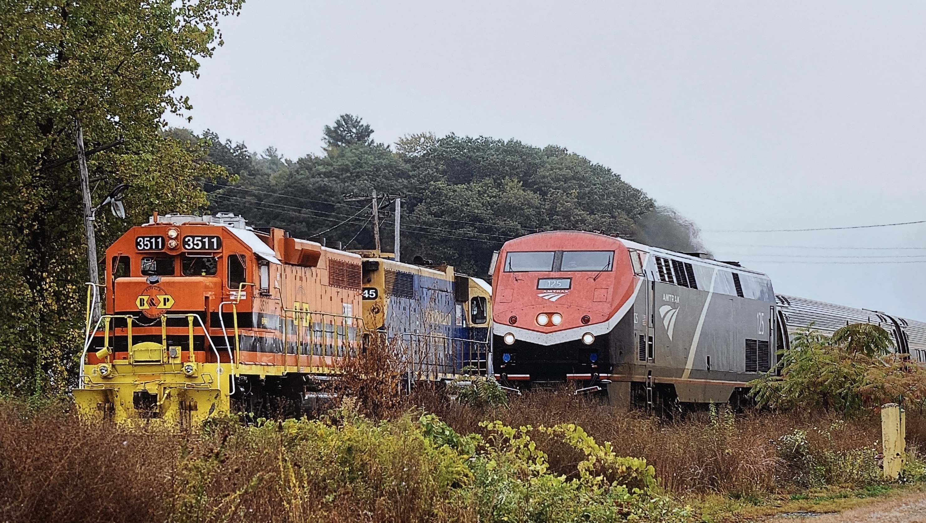The Brattleboro local with Buffalo & Pittsburg GP38-2 and NECR GP38 wait as the Vermonter flys by hitting the cross over at about 50mph.