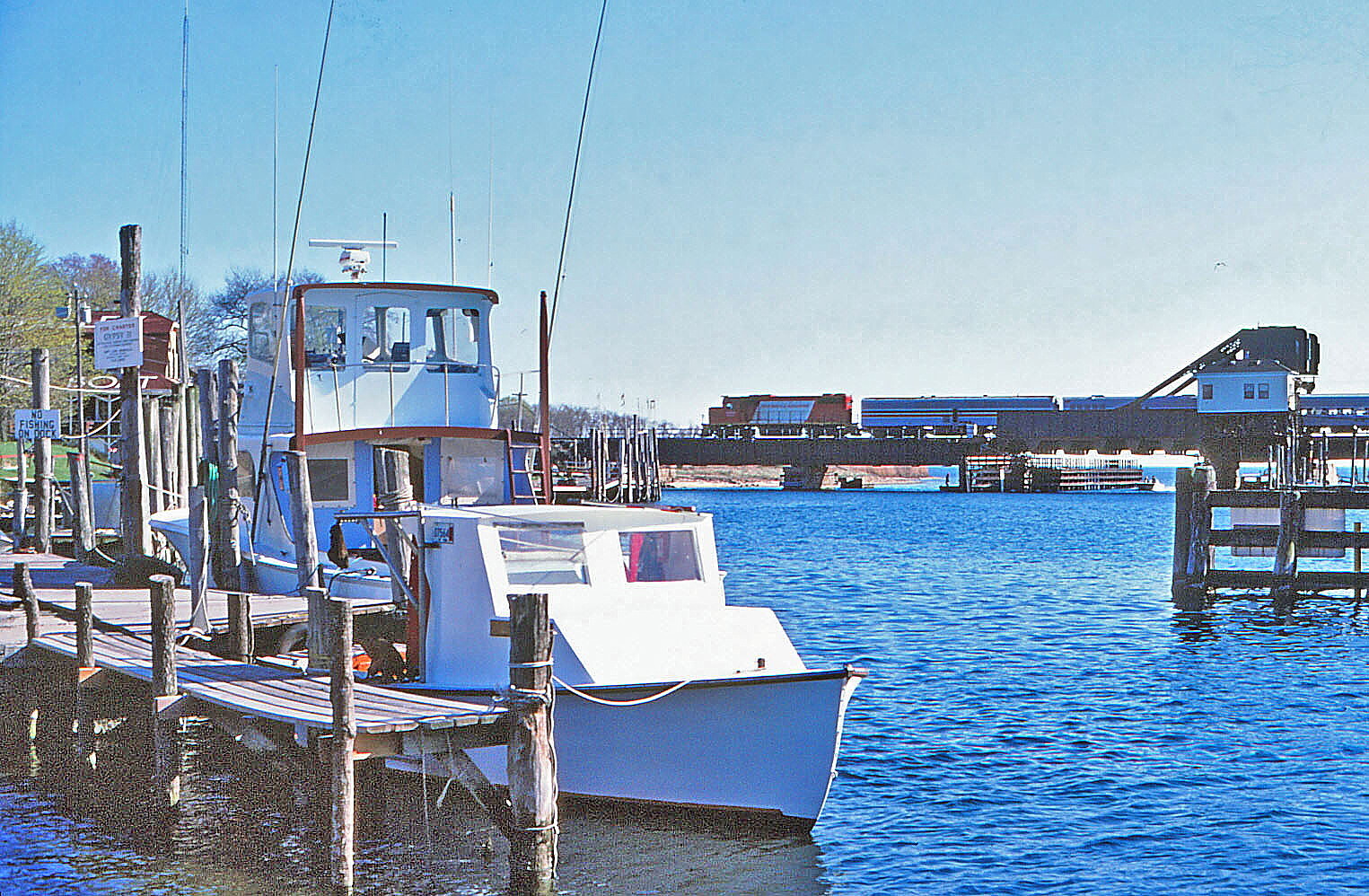 Providence & Worcester @ Niantic, Ct.An east bound excursion train crosses the Niantic River at the Gut over "Old Nan" a Scherzer through-girder bascule design bridge, built by the King Bridge Company in 1907 for the New York, New Haven and Hartford Railroad.