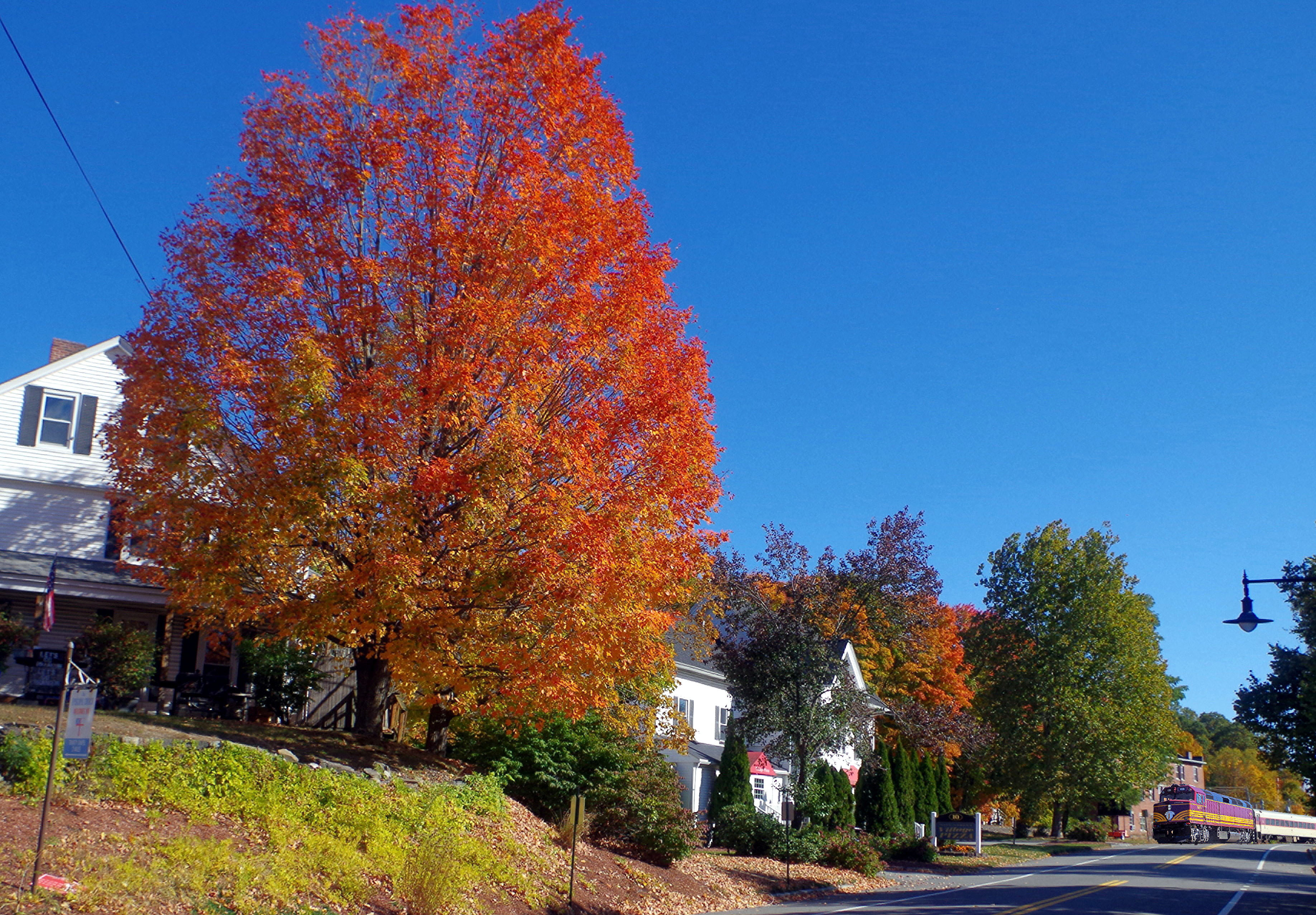 MBTA @ SHIRLEY, Ma. The T's 1030 leads its train across Ayer Road as it continues its run west. Photographed by Bruce Macdonald, October 14, 2025. Added to the photo archive by Bruce Macdonald, October 15, 2025. Railroad: Pan Am Southern. | Bruce Macdonald's awards: |        |