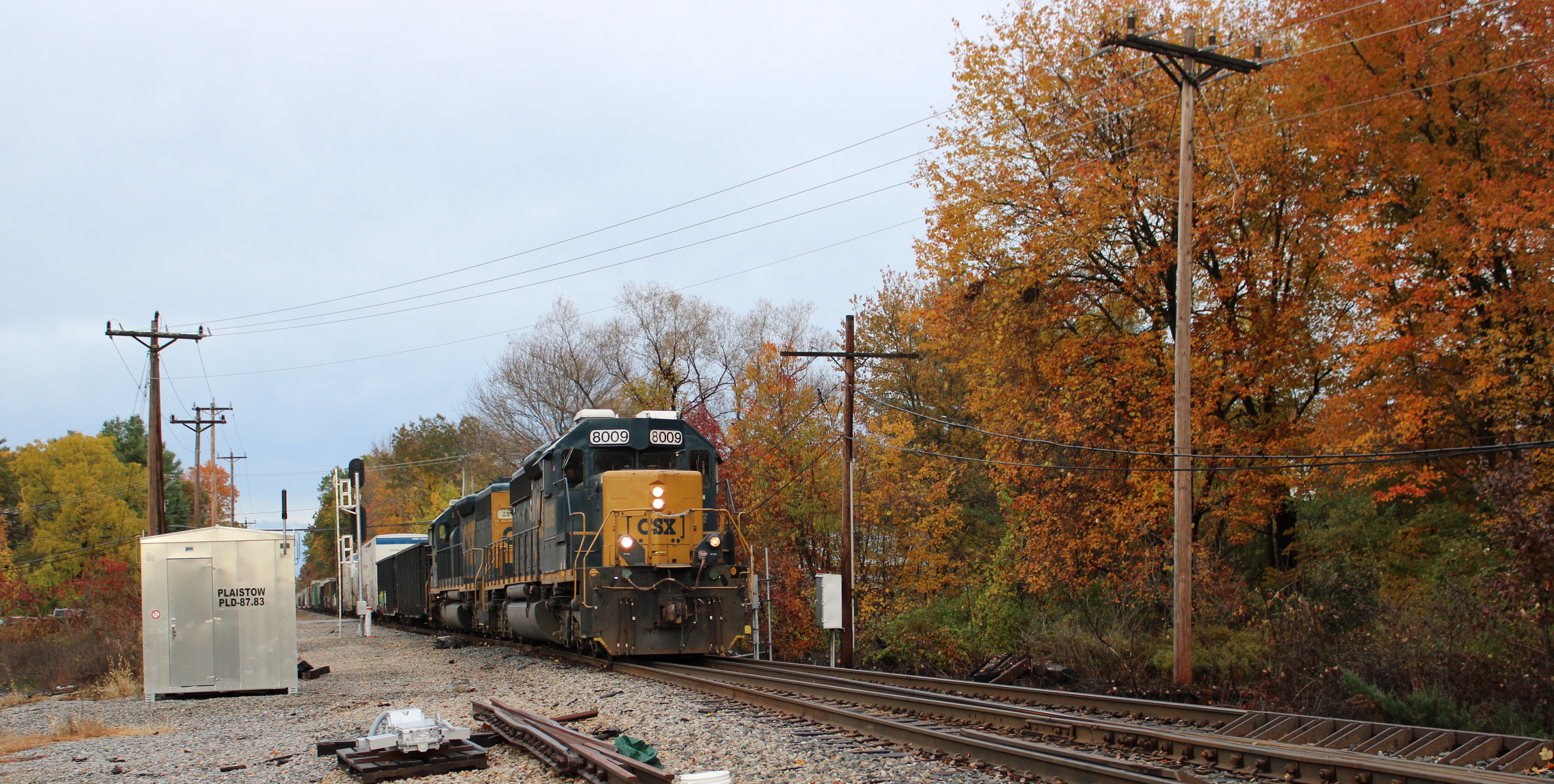 Westbound localL080-20 takes the number 2 track at CP-Plaistow in Plaistow NH with CSXT 8009 CSXT 8873 and 31 cars this evening.