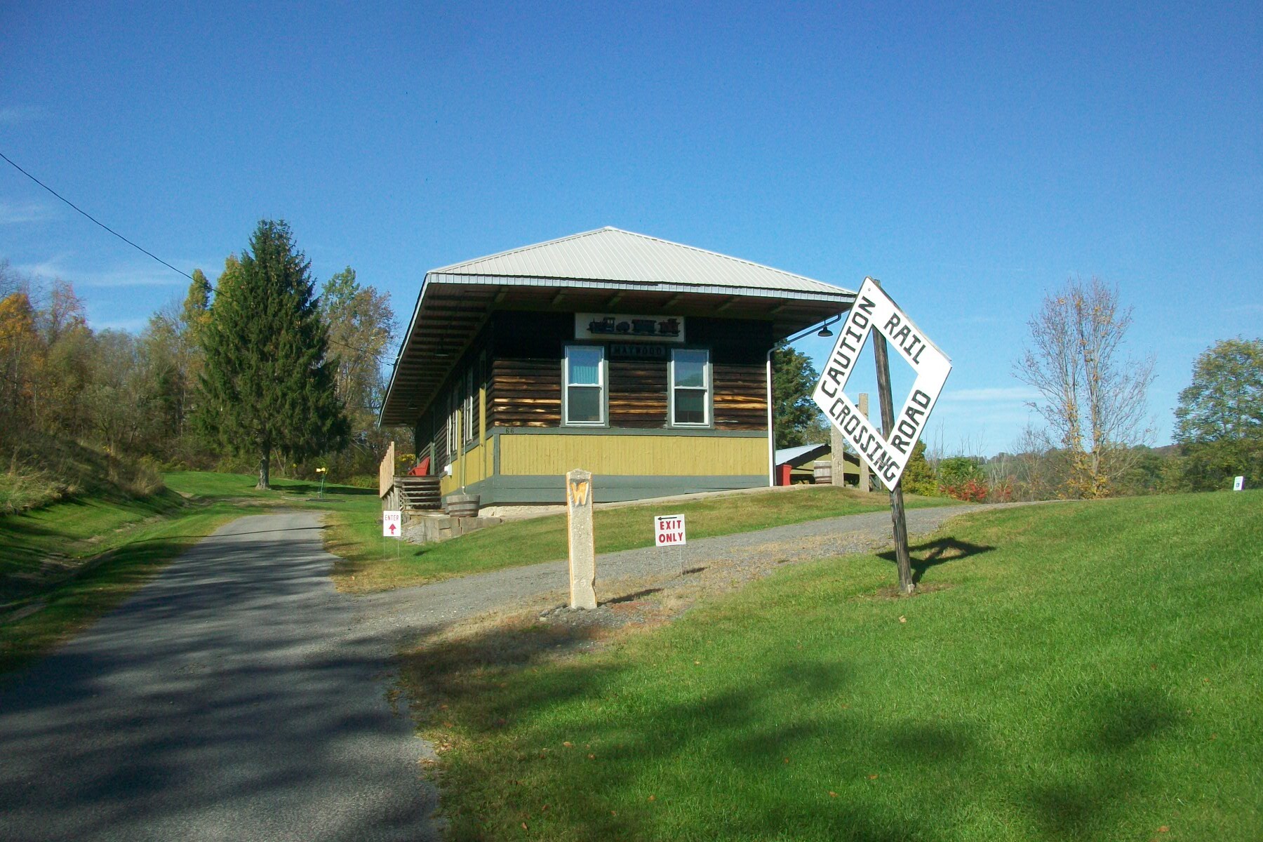 New York, Ontario & Western RR: Sidney Center, NY Maywood station with wooden crossbucks on the right Photographed by Chris Bigham, October 6, 2025. Added to the photo archive by Chris Bigham, October 22, 2025. Railroad: New York Ontario and Western. » Contact the person who posted this photograph.