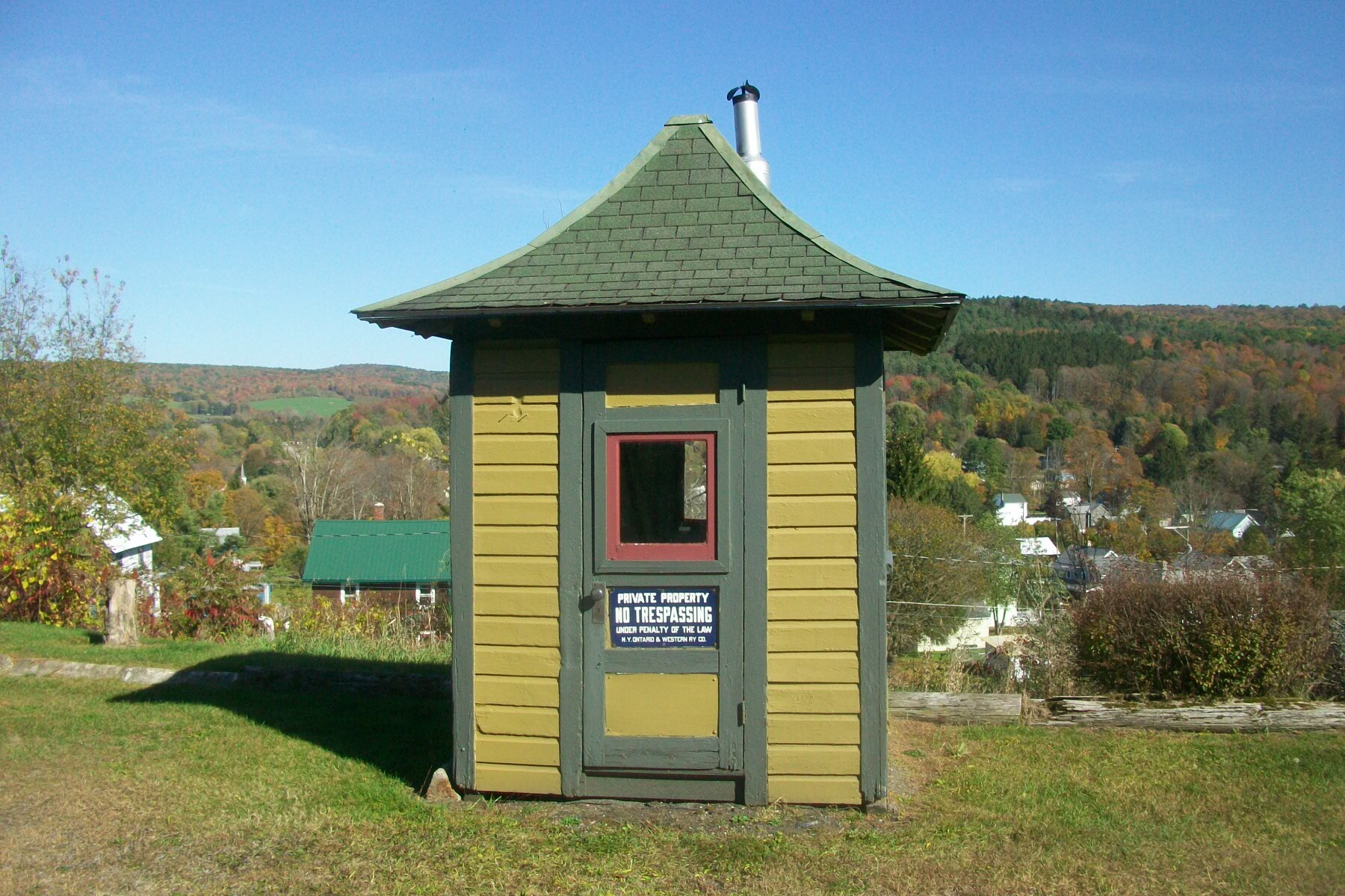 New York, Ontario & Western RR: Sidney Center, NY Crossing shanty restored Photographed by Chris Bigham, October 6, 2025. Added to the photo archive by Chris Bigham, October 22, 2025. Railroad: New York Ontario and Western. » Contact the person who posted this photograph.