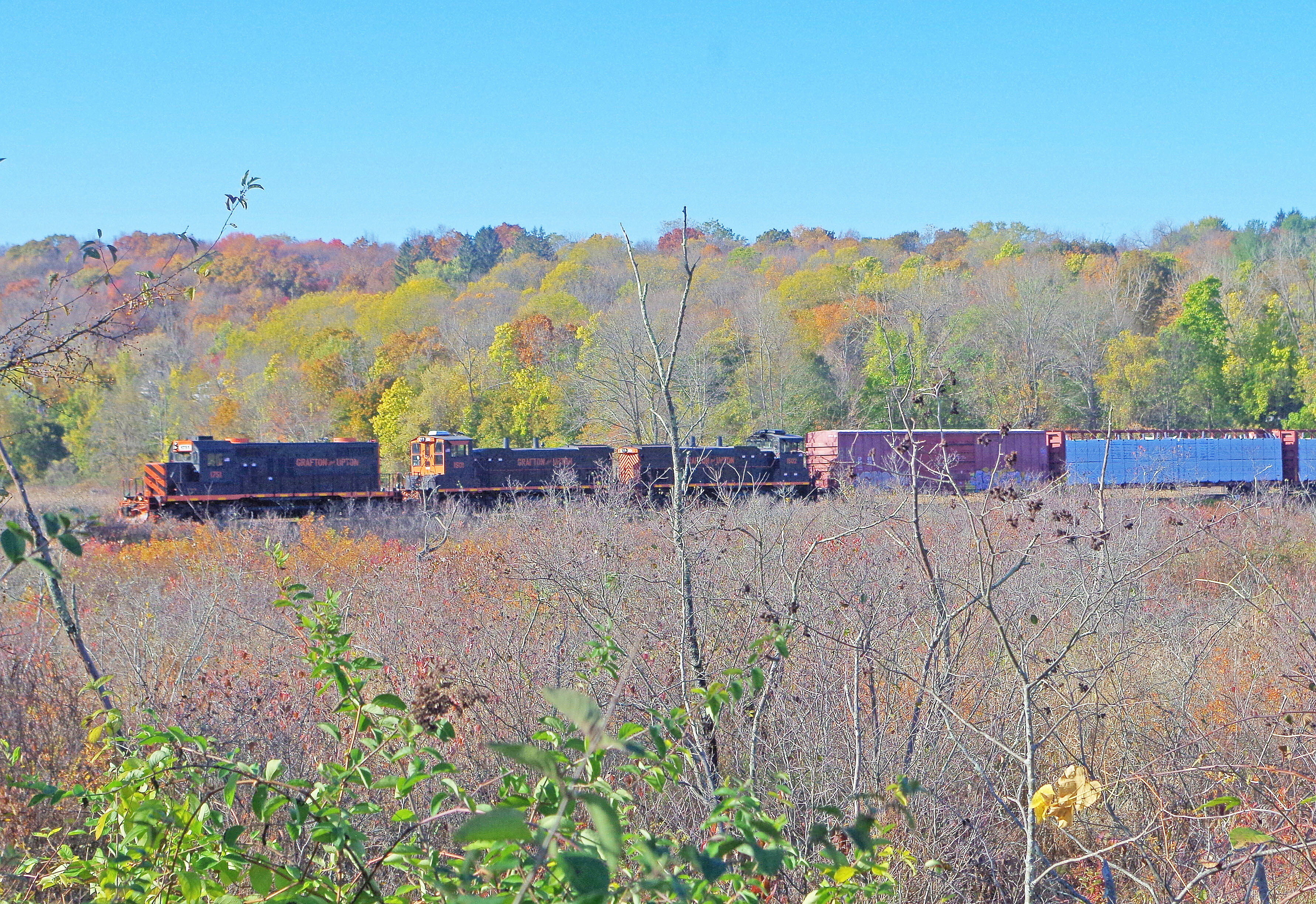 Grafton & Upton @ North Grafton, Ma. GU-1 crosses Big Bummer Brook as it begins its run south. Photographed by Bruce Macdonald, October 23, 2025. Added to the photo archive by Bruce Macdonald, October 23, 2025. Railroad: Grafton & Upton. | Bruce Macdonald's awards: |        |