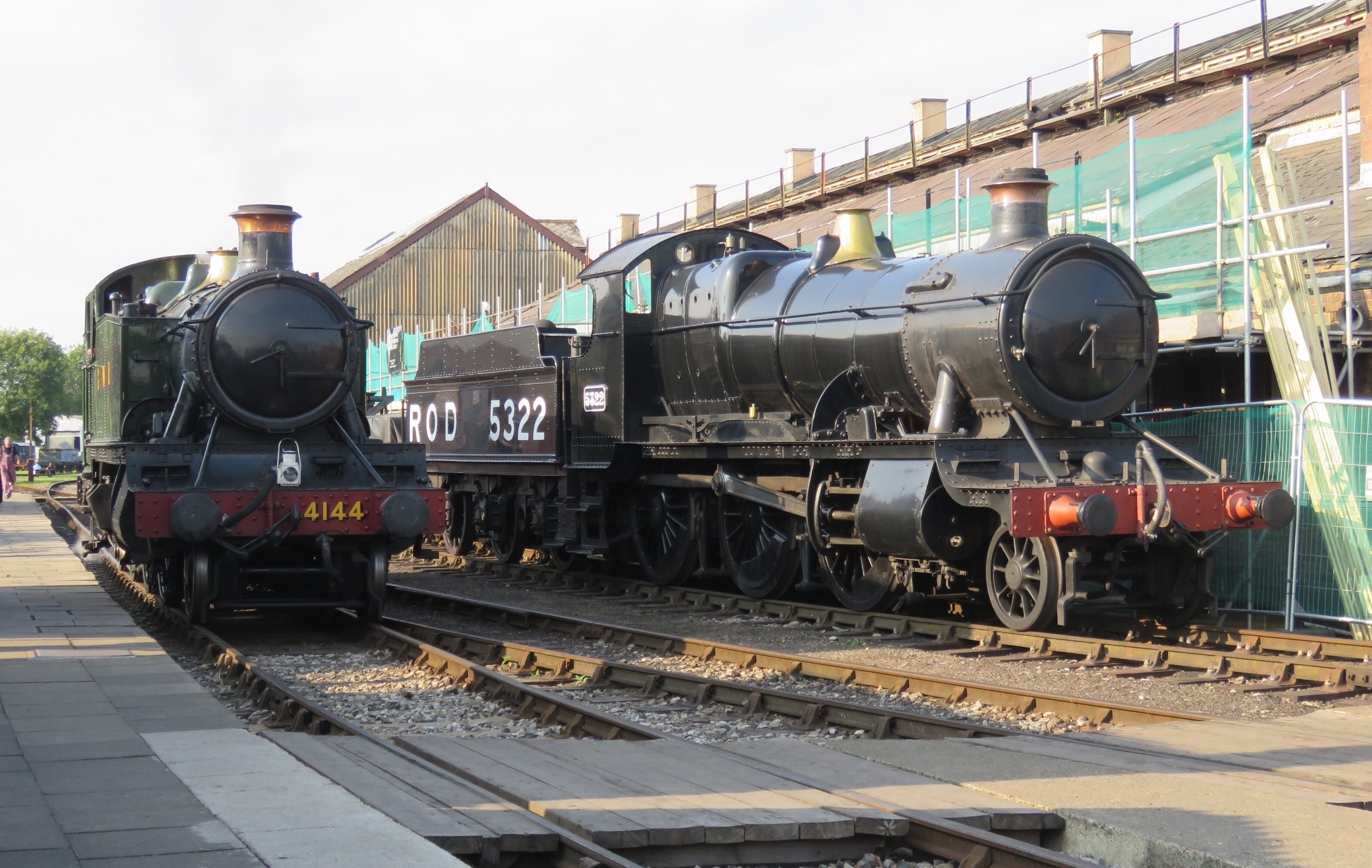 A scene at DidcotAs GWR Prairie tank 4144 passes statically posed GWR Mogul 5322.