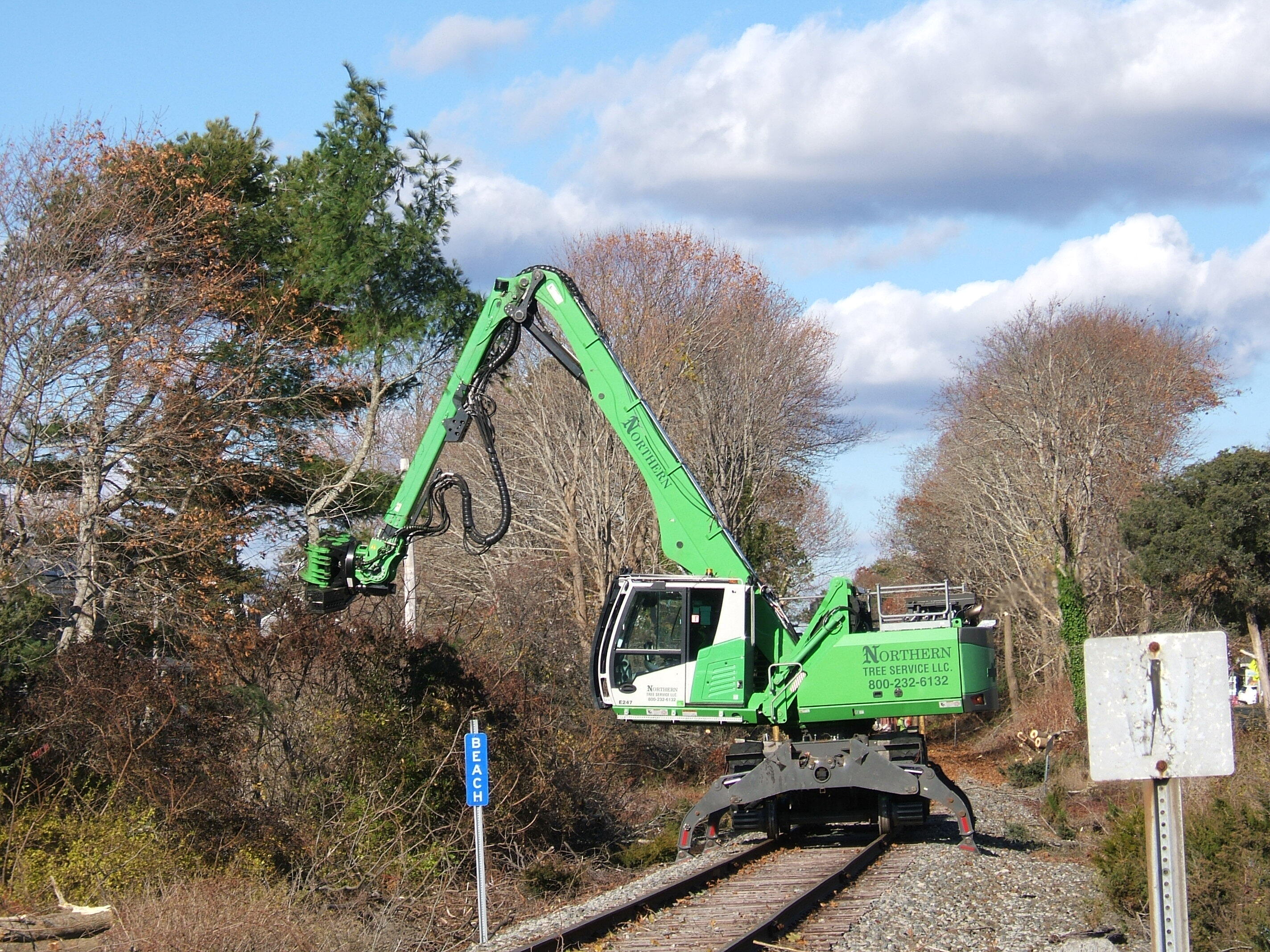 Northern Green monster continues work at MP 2.11 in Monument Beach MA cutting and stacking trees along side of the rail line ready to be chipped.