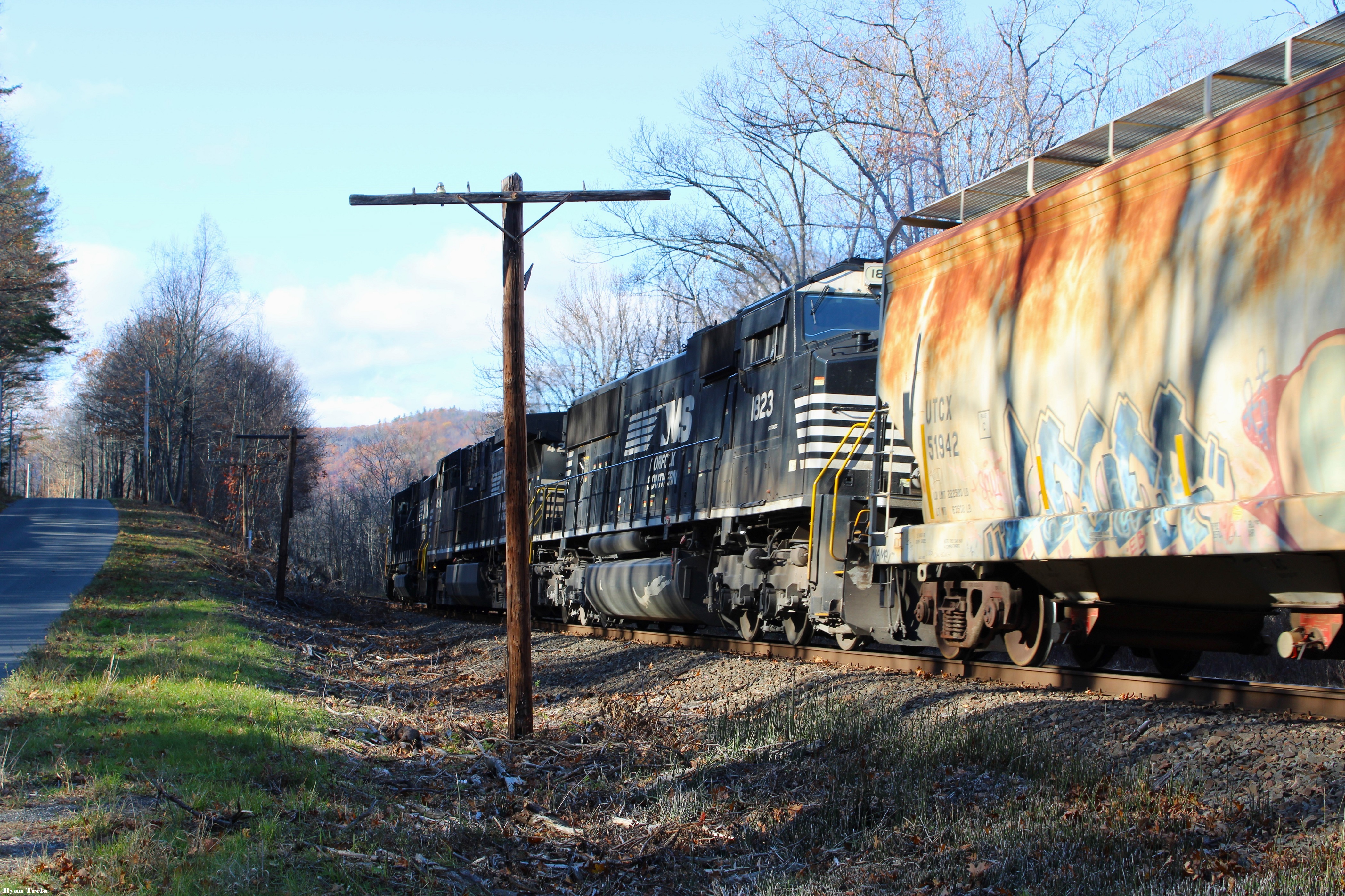 Westbound through Charlemount A westbound freight passes by tower road in Charlemount Photographed by Ryan Trela, November 2, 2025. Added to the photo archive by Ryan Trela, January 4, 2026. Railroad: Pan Am Southern. » Contact the person who posted this photograph.