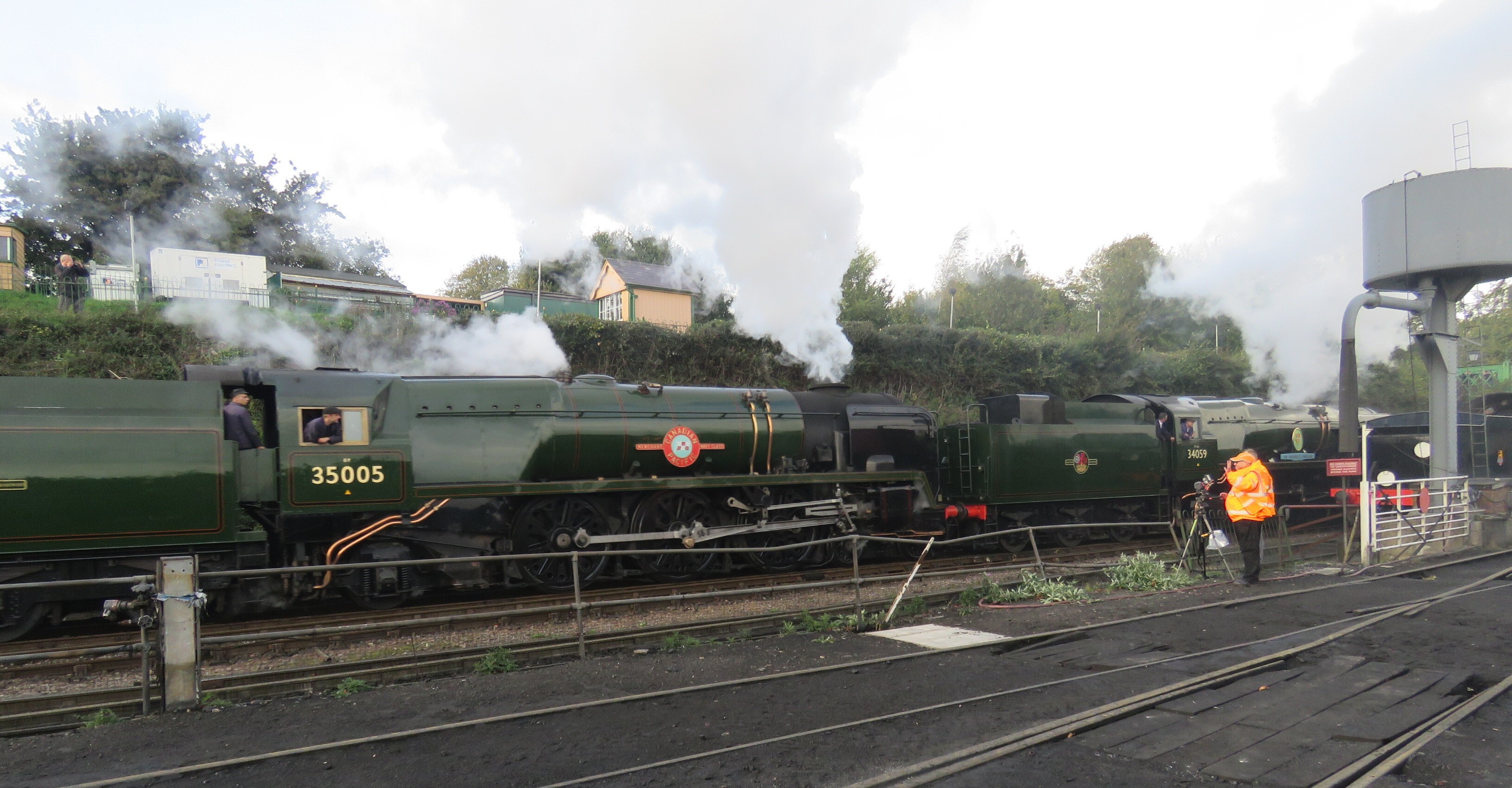 Double headed Bulleid PacificsBulleid Battle of Britain class Pacific 35059 Sir Archibald Sinclair and Bulleid Merchant Navy class Pacific 35005 Canadian Pacific head out of Ropley station.