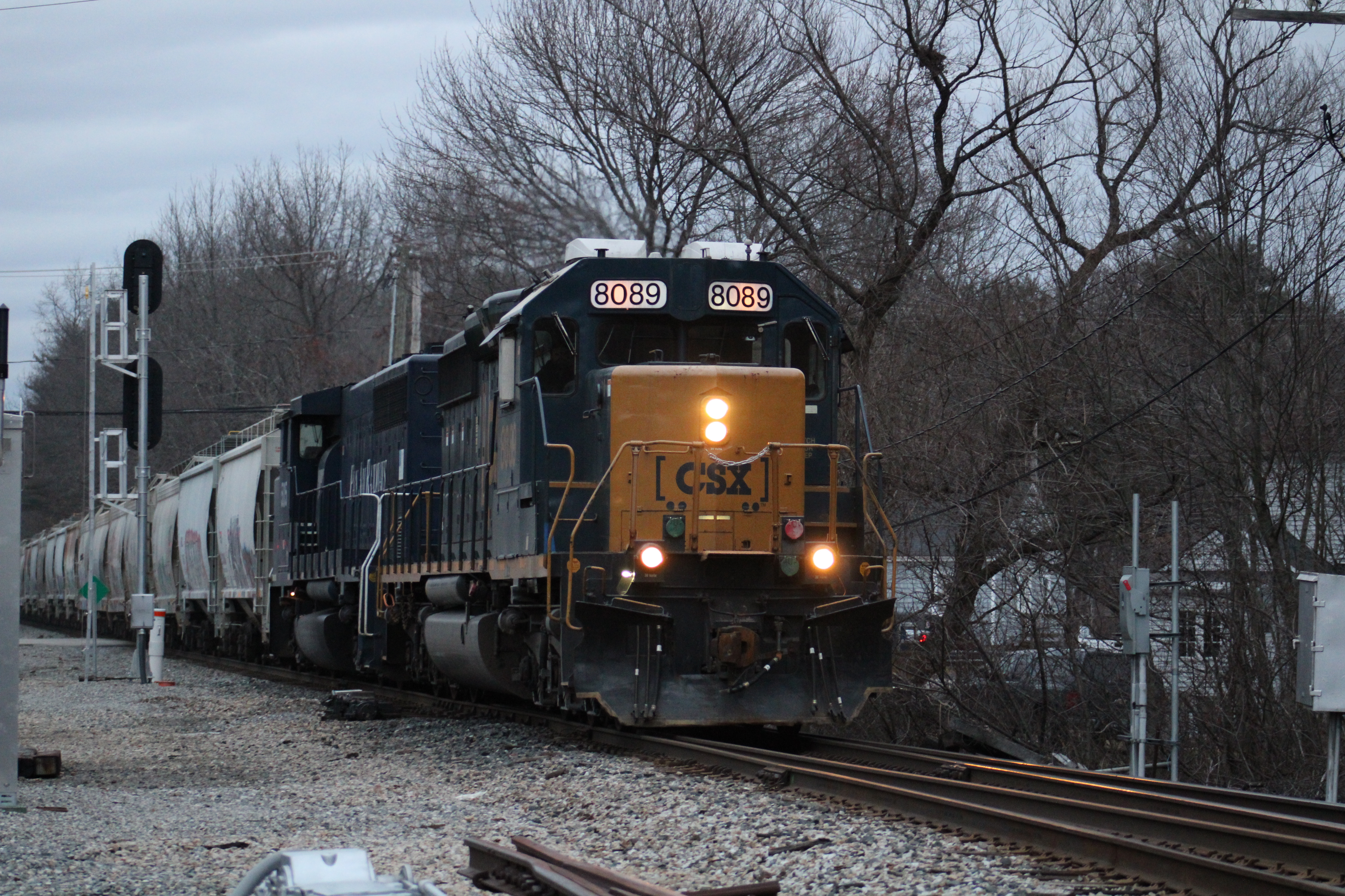 L080-14 westL080-14 with CSXT 8089-MEC 505 & 24 cars made a daylight appearance seen here at CP-Plaistow (Plaistow NH) taking the number 2 track.