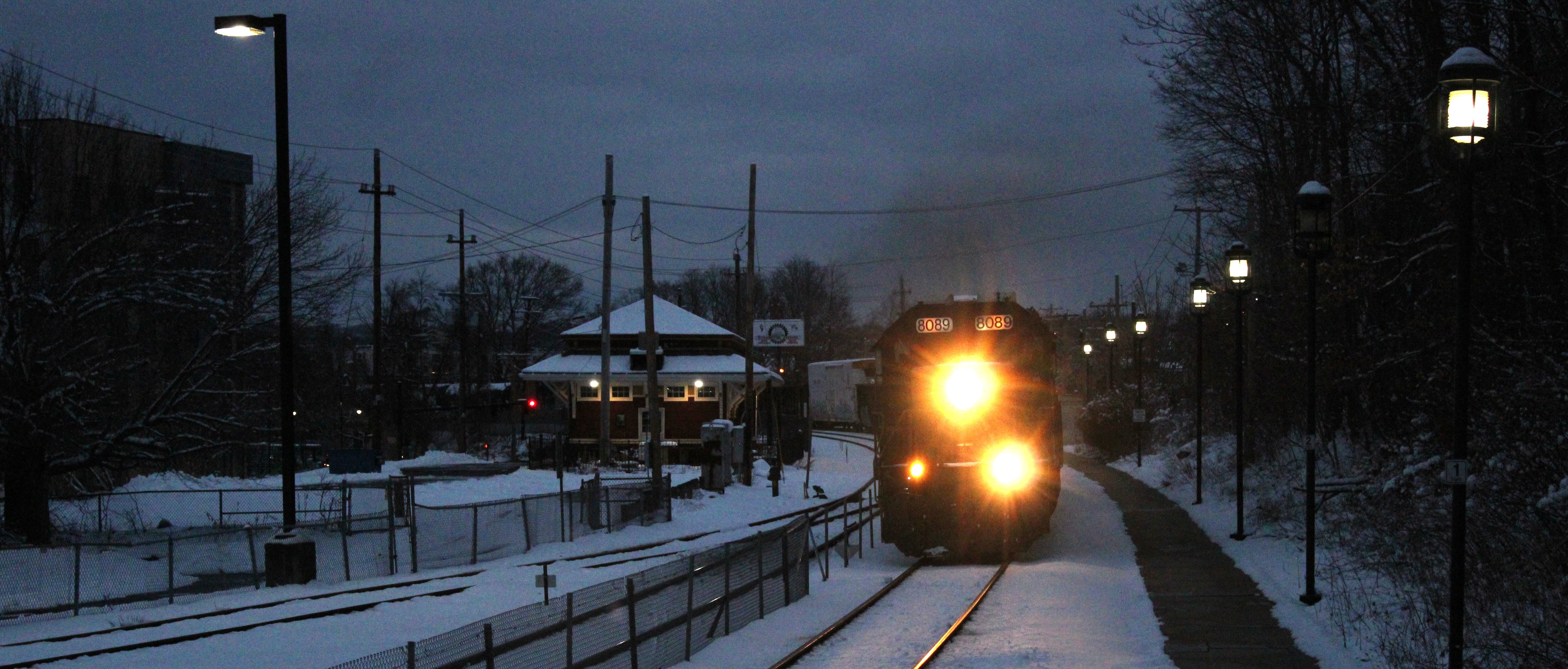 Westbound localL080-19 approaches Bradford station in Haverhill MA with CSXT 8089 and CSXT 8833 pulling 27 cars.