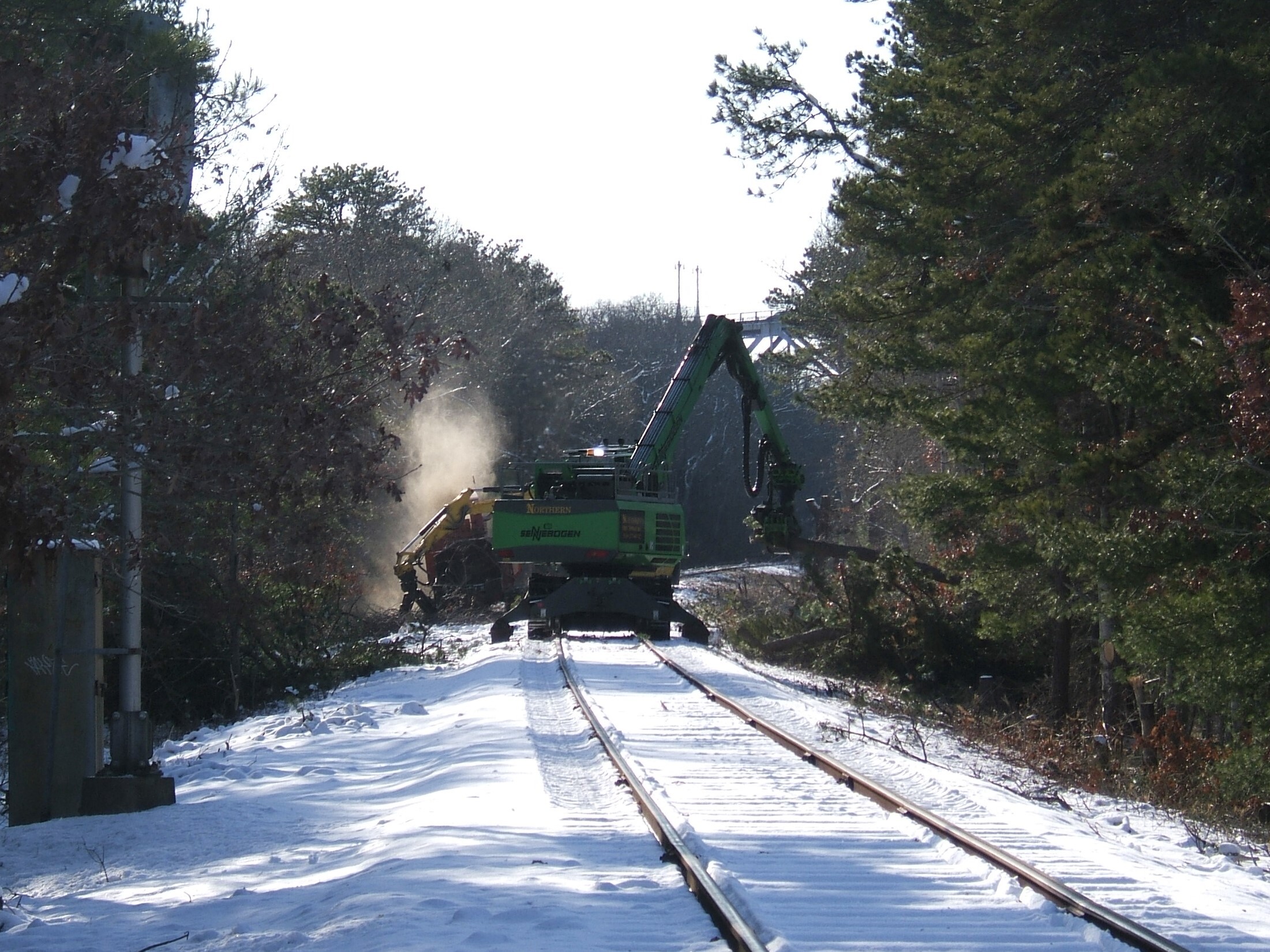 Tree cutter / chipper on the moveToday we find Northern Tree Services at MP 56.57 cutting trees and chipping wood on the Cape Main line. Presently behind Gallo ice arena in Bourne MA area working towards the east end of the Cape Cod Canal. Note old signal still in place on the left side by the tree