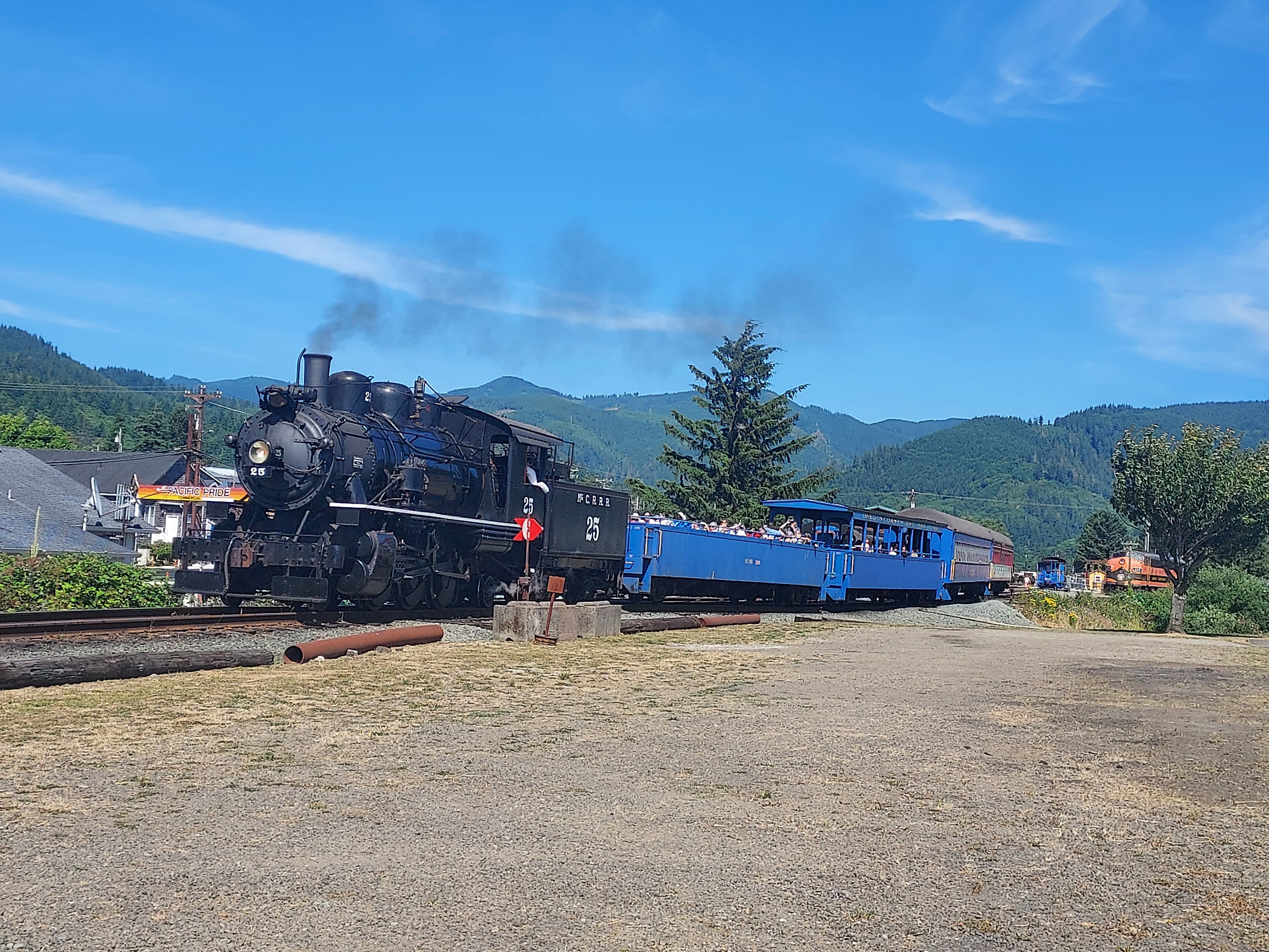 Steaming out of GaribaldiMcCloud River RR #25 leads an Oregon Coast Scenic RR excursion out of the depot at Garibaldi, OR. The OCSR operates an isolated segment of the former Port of Tillamook Bay RR in northwest Oregon.