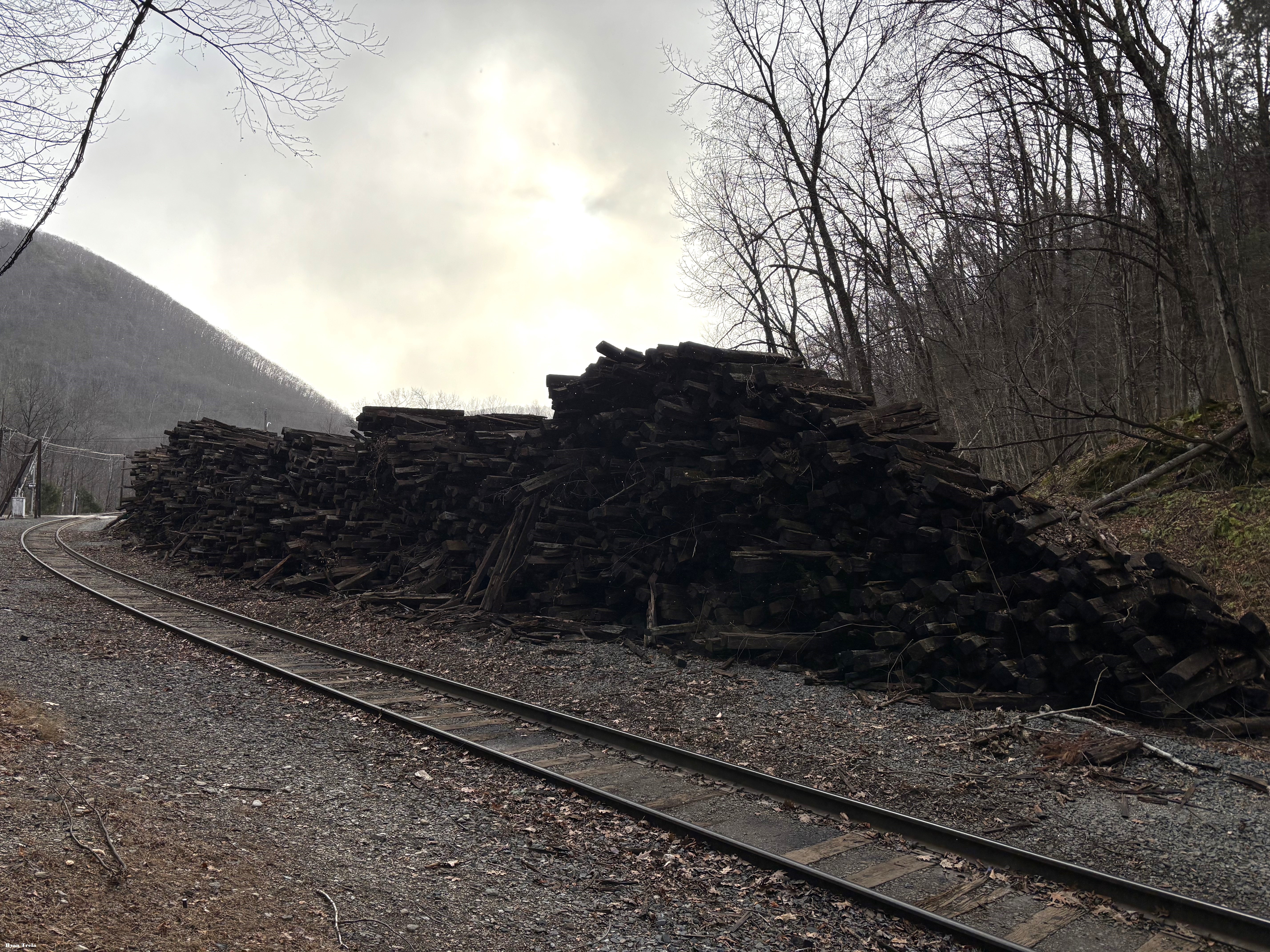 Massive pile of tiesDuring a visit earlier in November I noticed the pile of ties that had been sitting at the eastern tunnel entrance of the Hoosac tunnel was starting to be removed. Later that month I came back to this massive pile. It seems they've been removing all the old piles of ties along the west to east. They brought here via high-rail truck then loaded them up on another truck and hauled out.