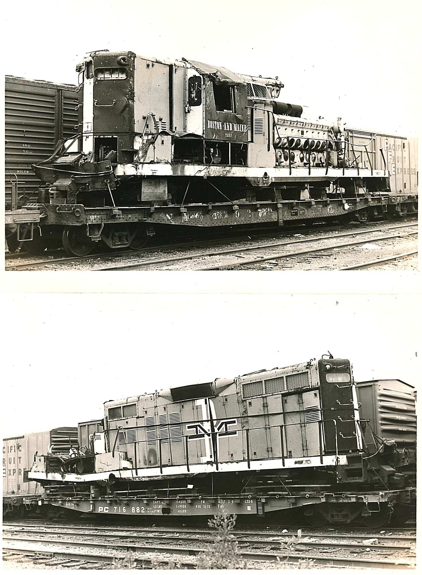 LOWELL, MABM 1710 GP-9 (top) and BM 1735 GP-9 (bottom) on Penn Central flat cars being returned home. Both units involved in loaded Bow Coal train derailment on Penn Central in Ashtabula, OH September, 1968.