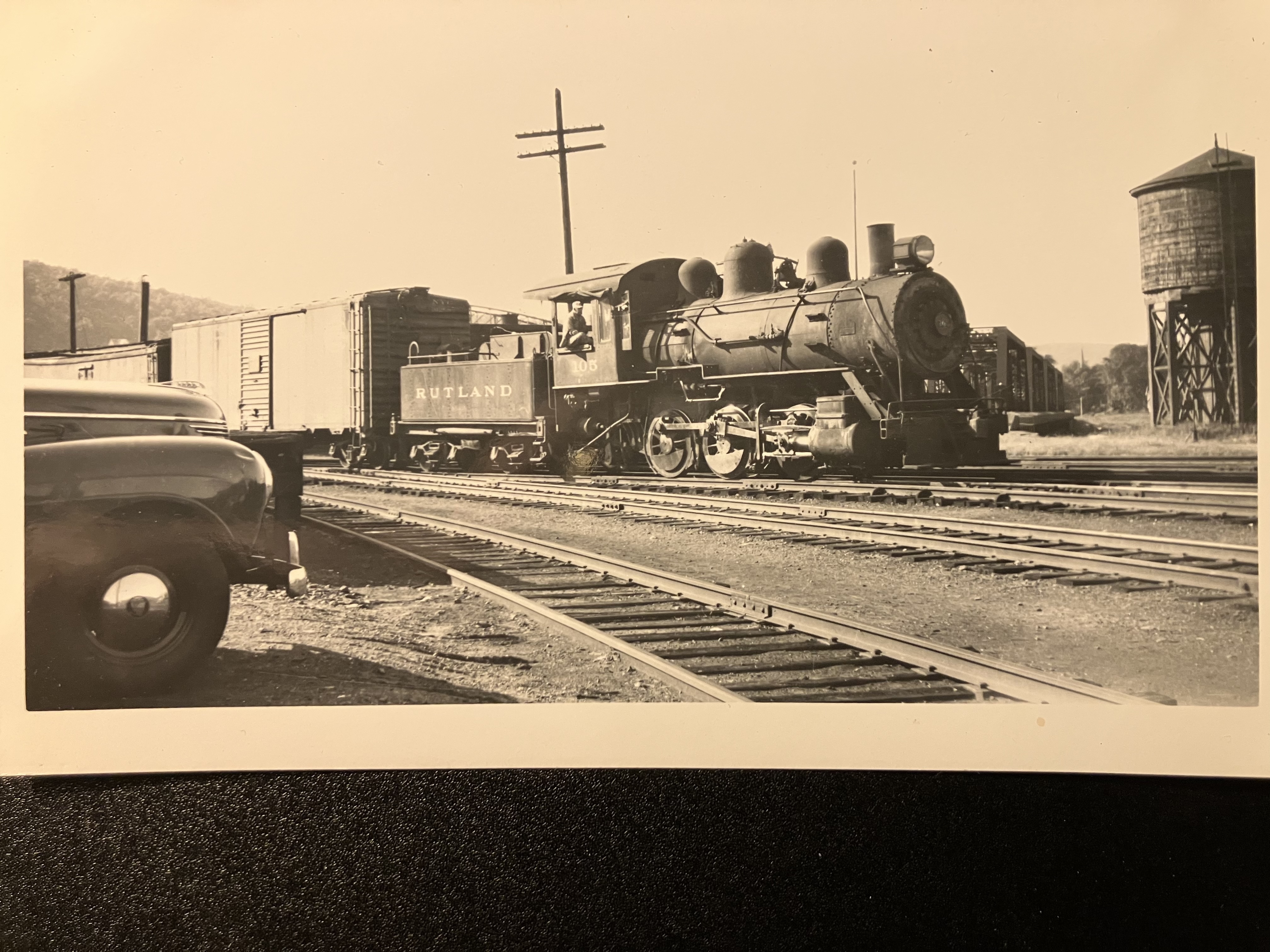 Here’s another old photo I picked up: Rutland 0-6-0 switcher No. 105 at an unknown location and date, photographed by an unknown photographer. Could it perhaps be heading south/east into Bellows Falls yard? In which case the truss bridge behind the locomotive would be the B&M Connecticut River bridge? Date might be late 1940s based on the auto in the foreground. I’m guessing summertime by the engineer’s position on the cab window sill. More info & guesses are welcome!