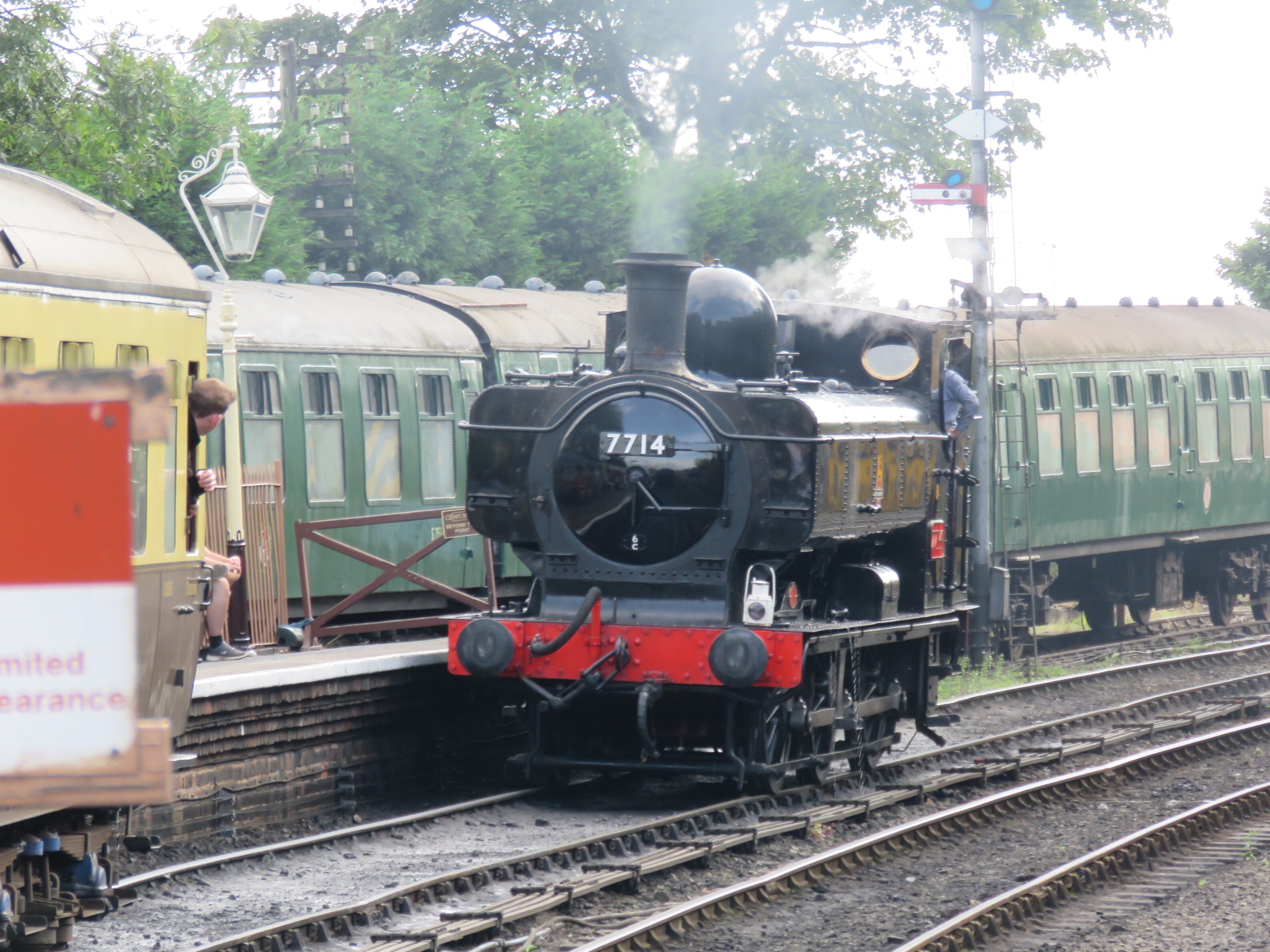 7714 at BridgnorthGWR 0-6-0 pannier tank 7714 heads towards its next consist, at Bridgnorth station.