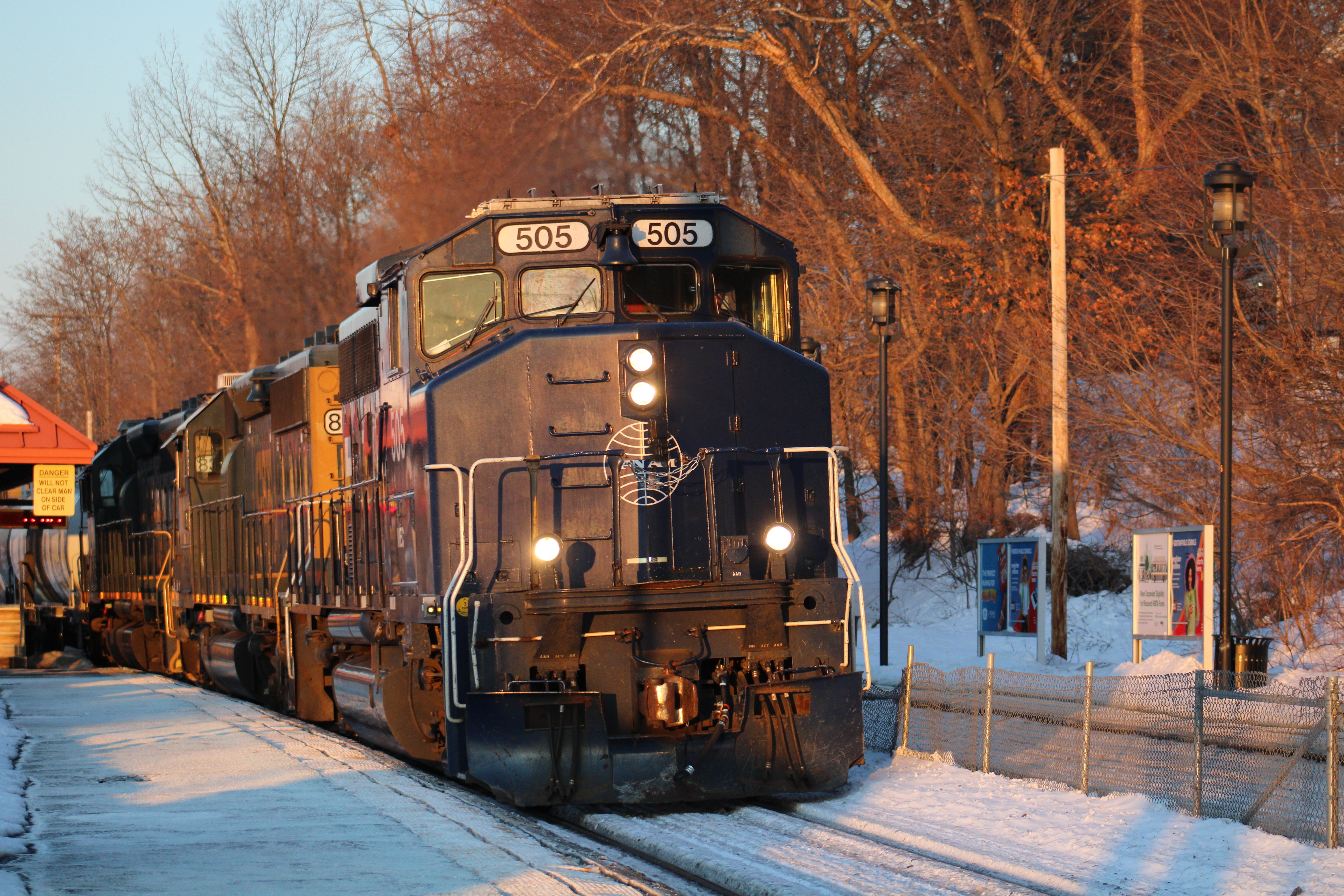 Westbound localL080-04 west with MEC 505-CSXT 8009-CSXT 8365 and 27 cars rolls thru Bradford station in Haverhill MA headed to Lawrence yard. 505 and the cars got dropped. Nashua now has 505 as of today 2/5.