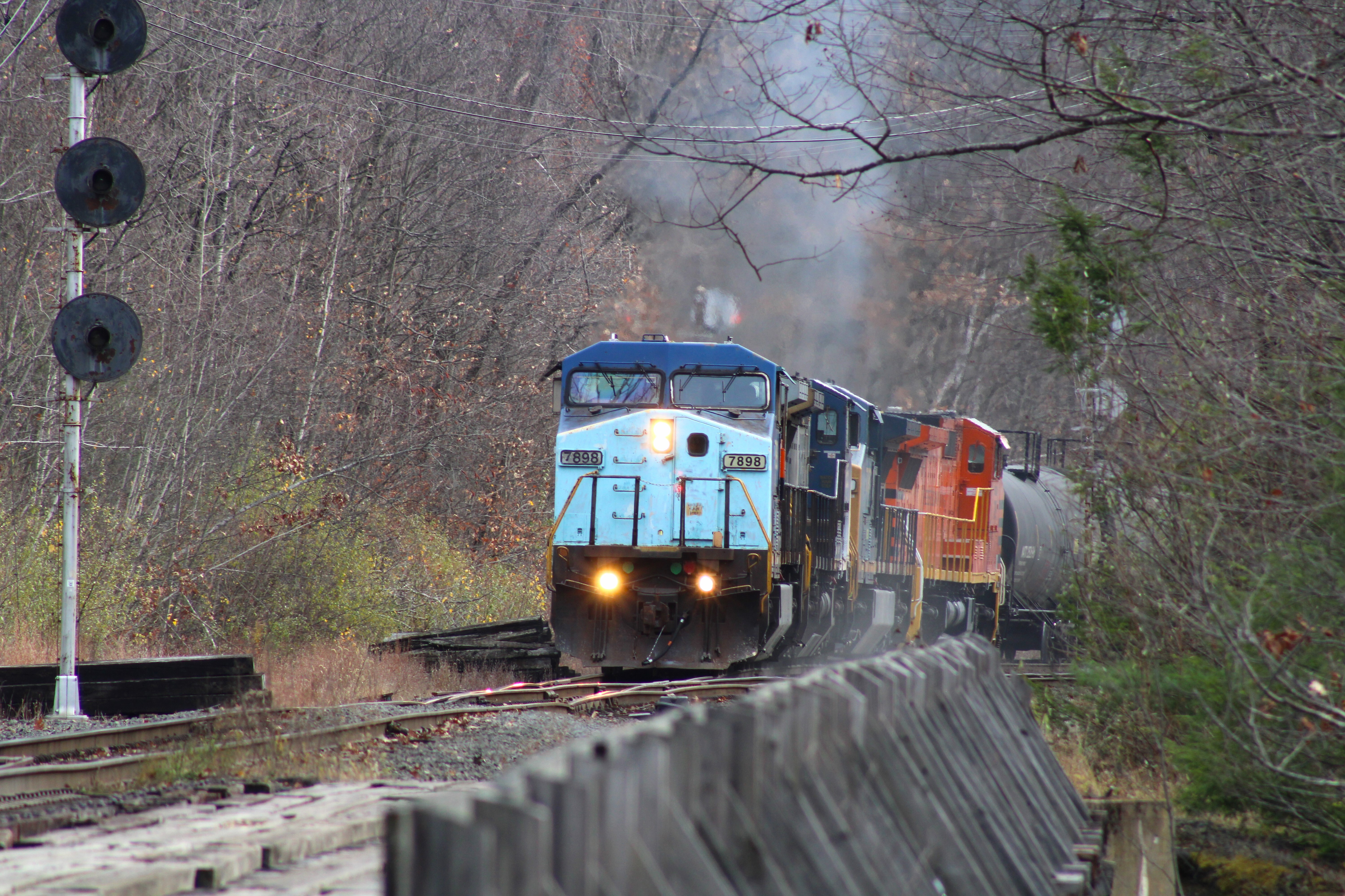 Westbound at the tunnelEDMO with #7898 in the lead throttles up about to cross the Deerfield river bridge and then head into the tunnel