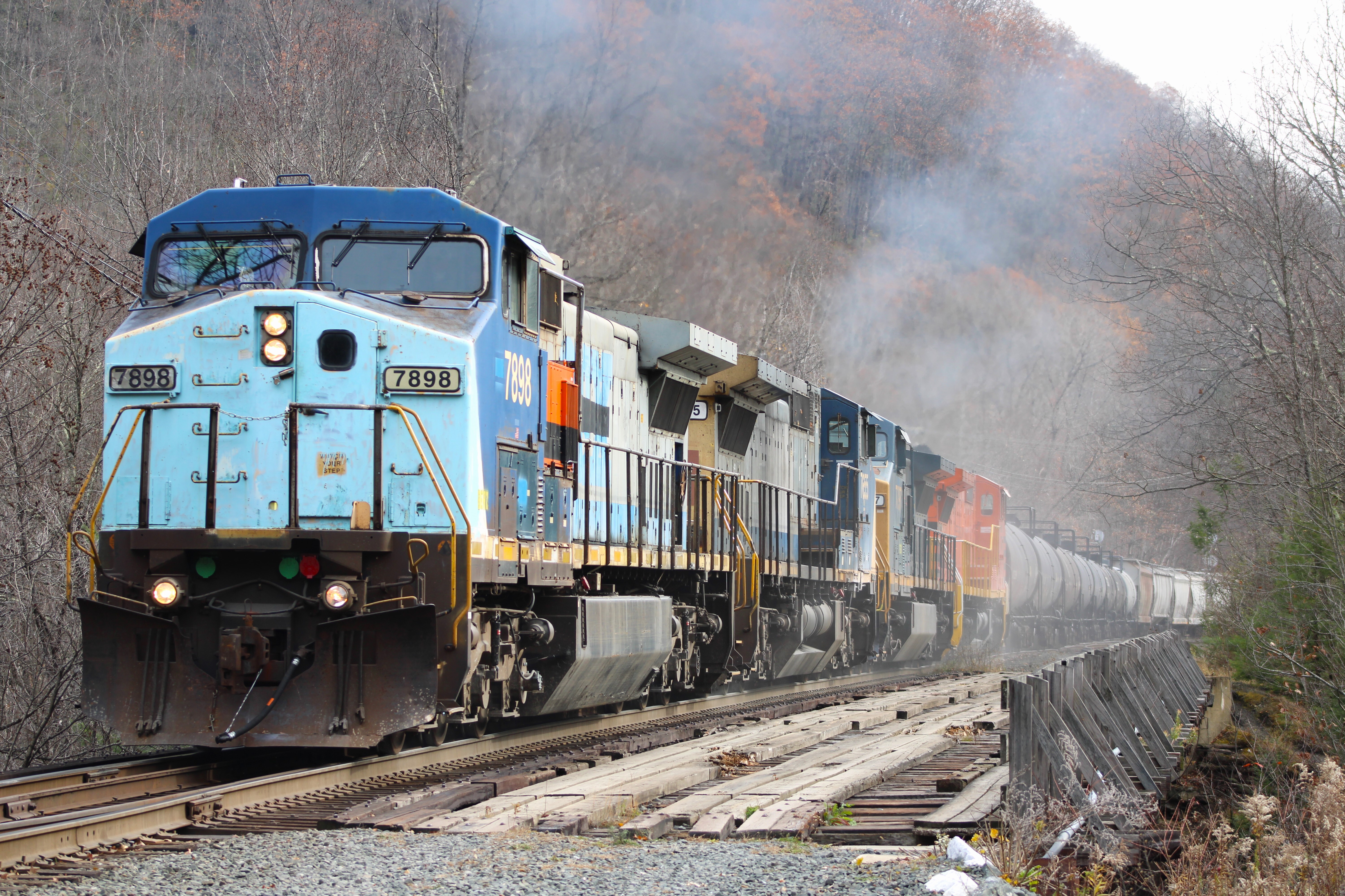 Westbound at the tunnelEDMO with #7898 in the lead throttles up about to cross the Deerfield river bridge and then head into the tunnel with a pretty long train in tow