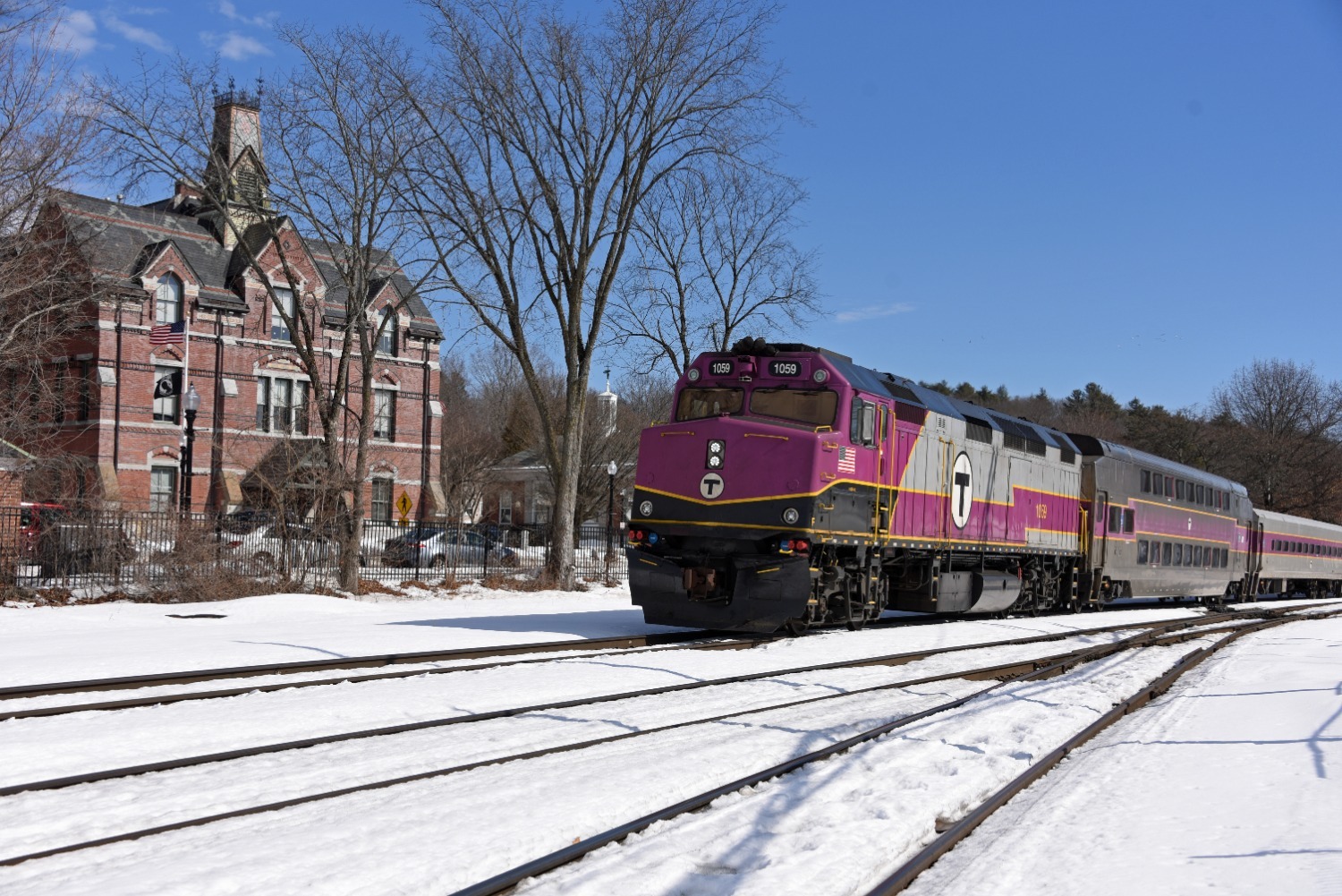 Ayer Arrival MBTA 1403 announces its presence at Ayer, MA. Photographed by Alan Marshall, February 28, 2026. Added to the photo archive by Alan Marshall, February 28, 2026. Railroad: MBTA. » Contact the person who posted this photograph.
