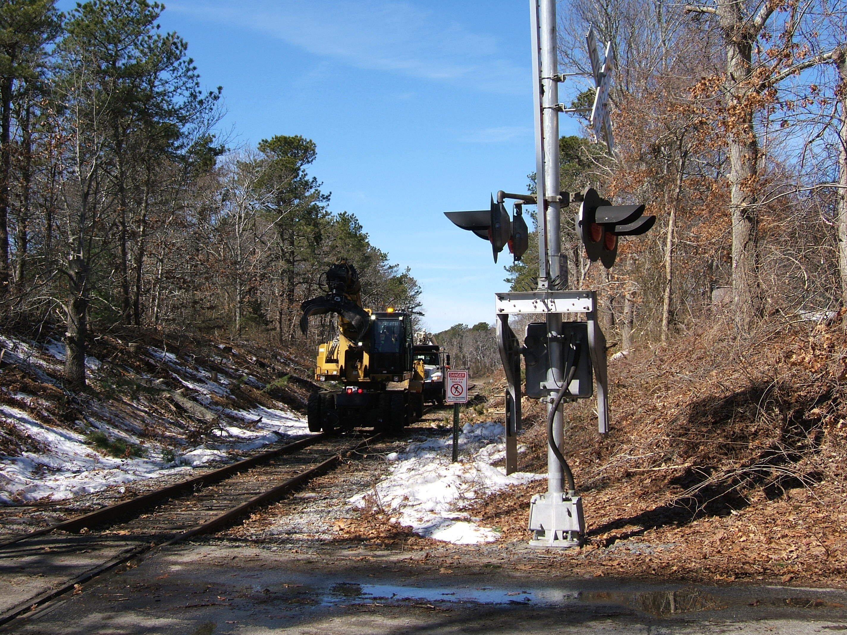 Northern Tree crew at Cape Main MP 63.37Gradall / Chipper / Bucket truck getting ready to advance past Cape Main MP 63.37 Great Island Road RR crossing in Sandwich MA