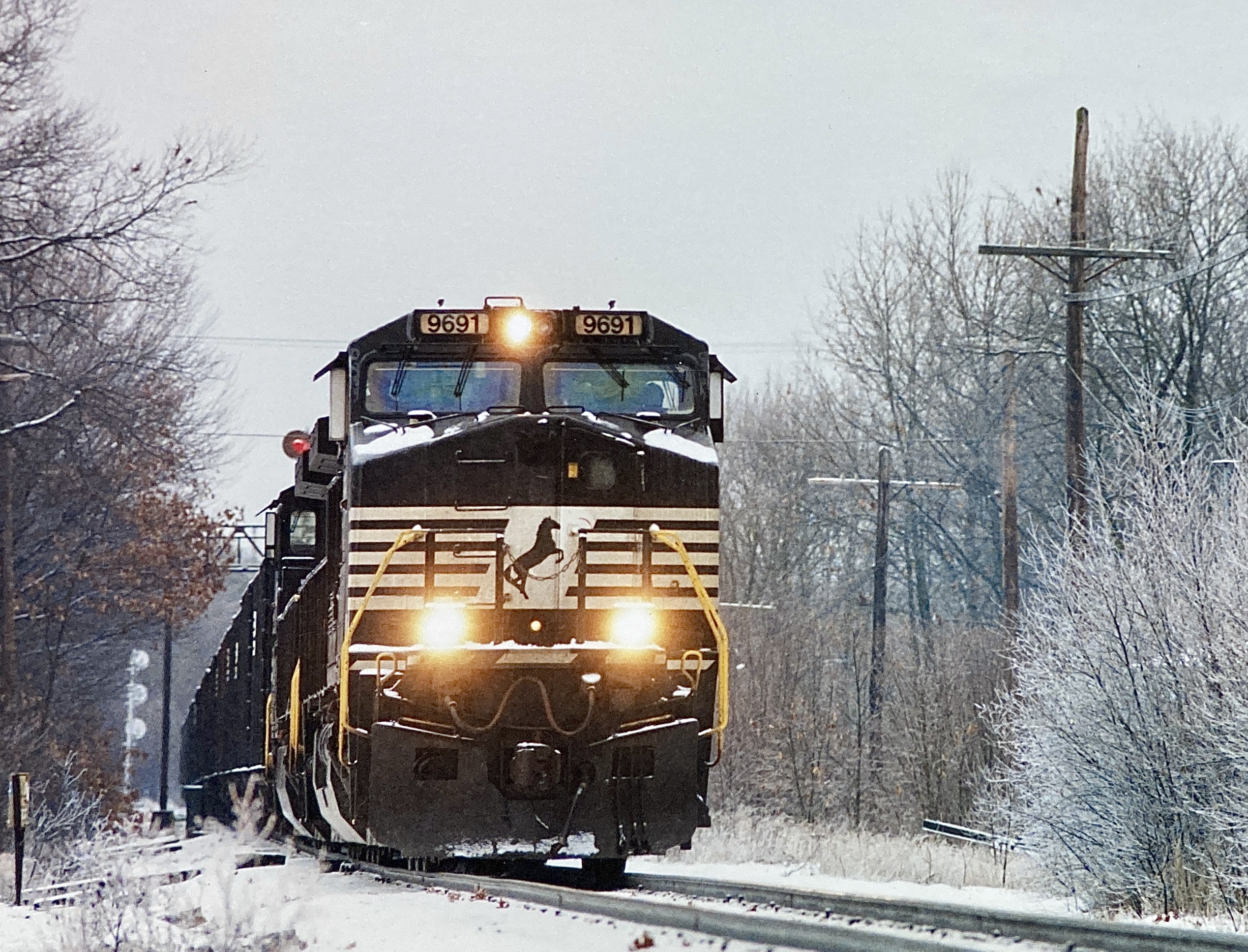 Empty Bow NH coal train at Parkers interlocking after a December ice storm in 2004.