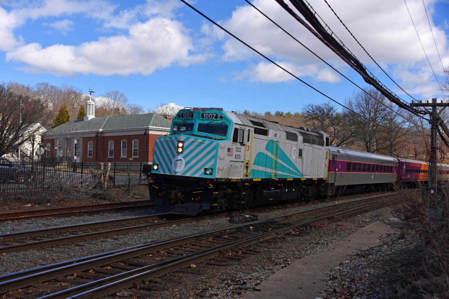 Something DifferentOutbound commuter passes the Post Office at Ayer, MA with a Rolling Stock Solutions leader RSTX 1002.