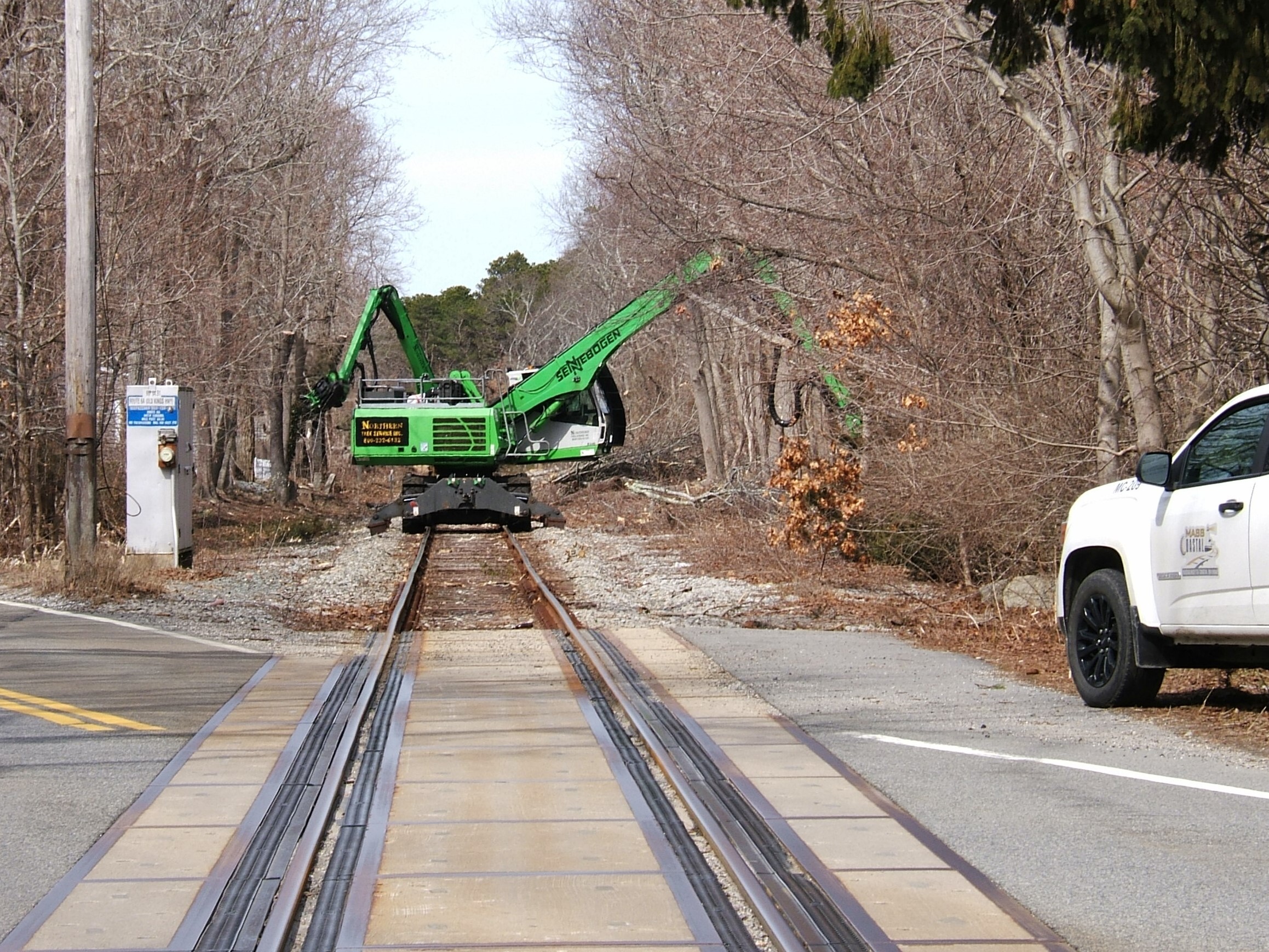 Tree cutters ready to cross Rte. 6ANorthern Tree cutters approaching the Rte. 6A MP 64.91 RR crossing in Sandwich MA. Mass Coastal truck standing by with signals shut down to stop traffic so equipment can cross over to the other side for continued work.