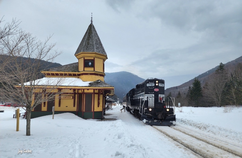 CSRX 1751 at Crawford'sFrom 2/28/2026, here was the Conway Scenic Railroad's Winter Mountaineer heading west through Crawford Station to Fabyan Station with the GP9 leading long hood forward.