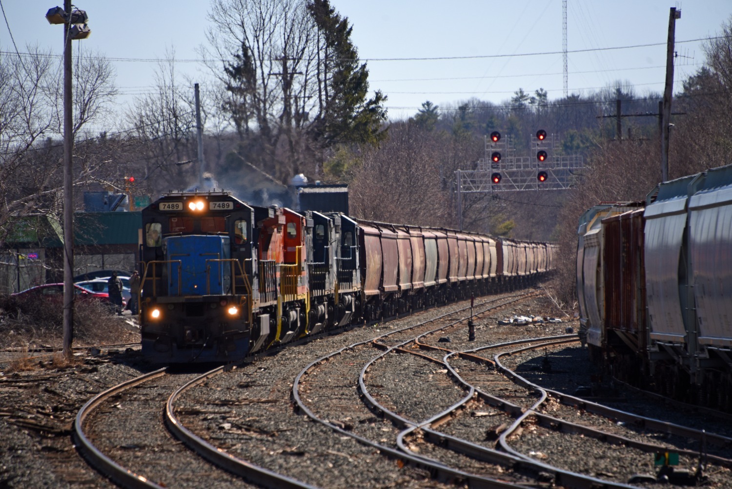 EGT - Chair City4 B&E 6-axles power the empty grain through Gardner, MA yard.